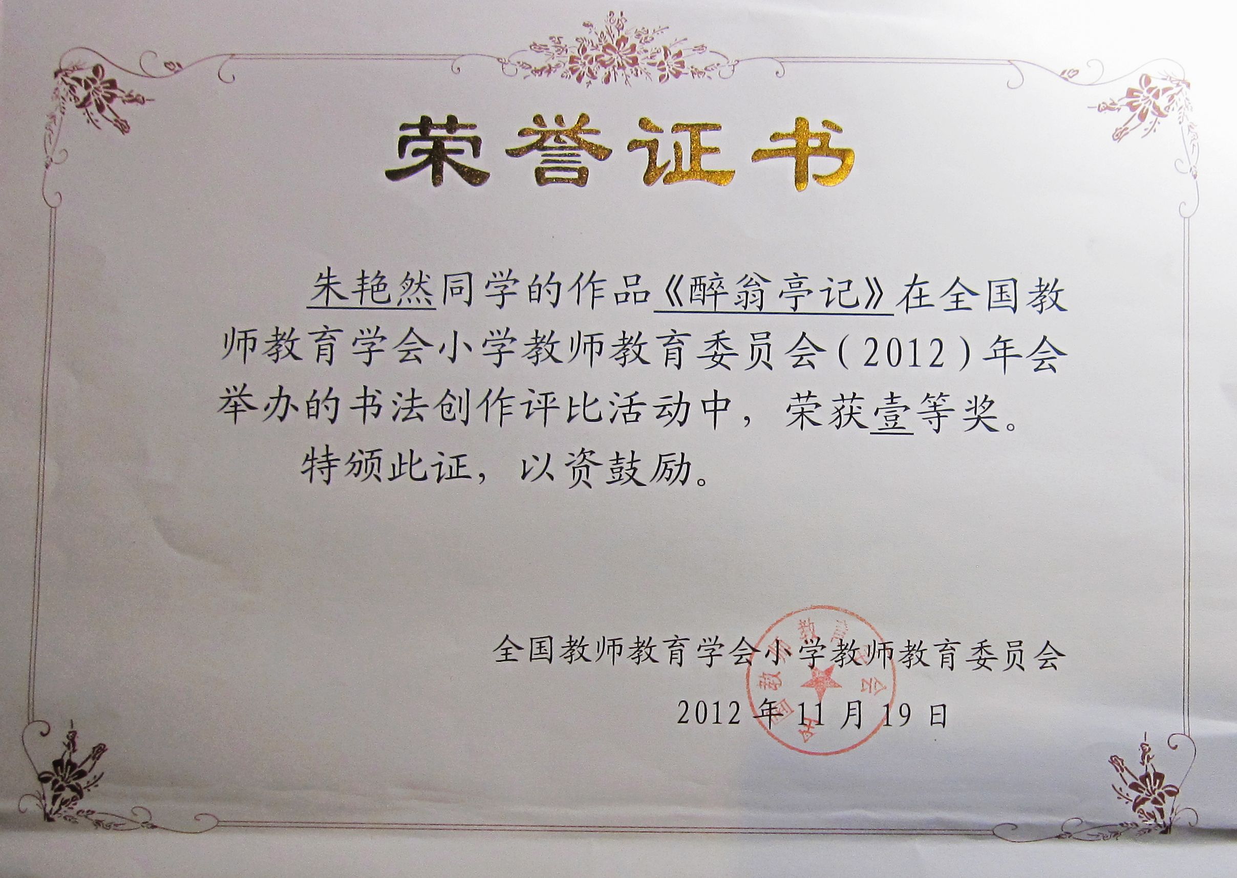 全国教师教育学会小学教师教育委员会(2012)年会期间,全国小学教育专业学生书法获奖作品在天津师范大学雅艺楼展出。我院小教系选送的朱艳然同学的书法作品荣获一等奖。
