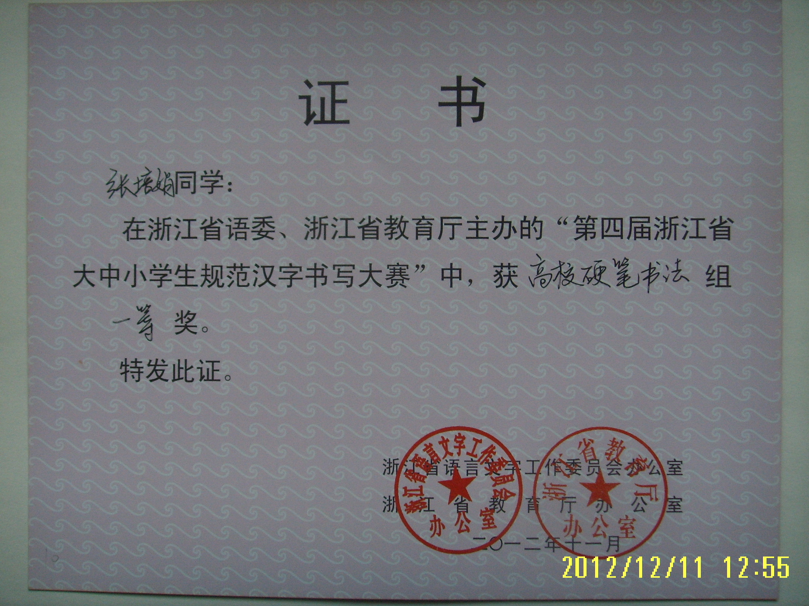 浙江省语言文字工作委员会、省教育厅举办的“第四届浙江省大中小学生规范汉字书写大赛”评审结果揭晓,我院张培娟荣获高校硬笔组一等奖,程逊、王若子荣获三等奖,周伶俐荣获优秀奖;林可松老师获得“优秀指导教师奖”。