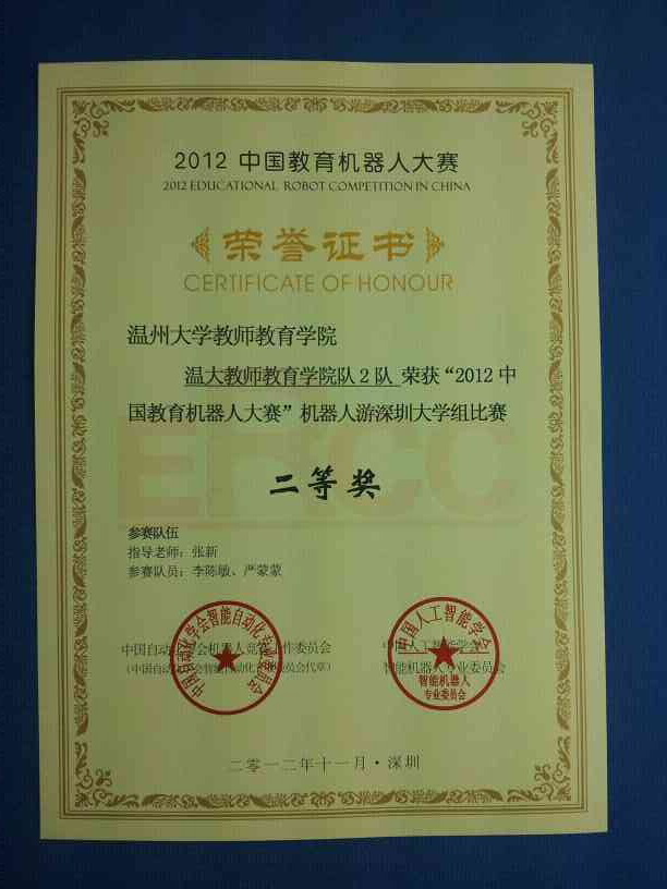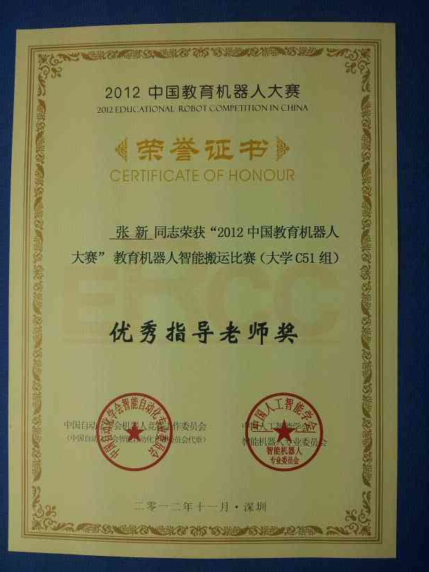 机器人深圳游2队均荣获教育机器人机器人游深圳比赛(大学组)二等奖。此外,由于我院三支参赛队伍成绩突出,张新老师荣获优秀指导老师奖。