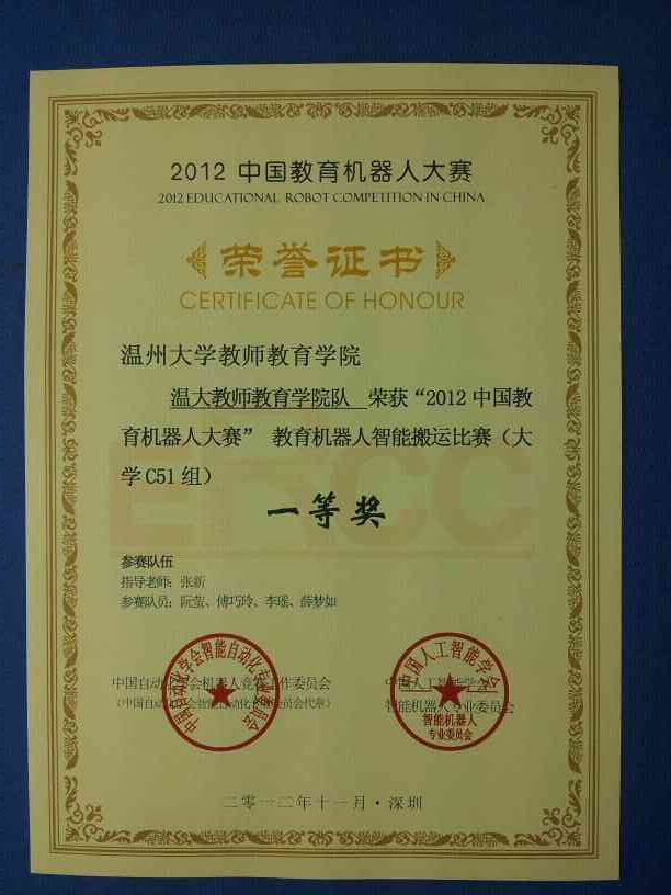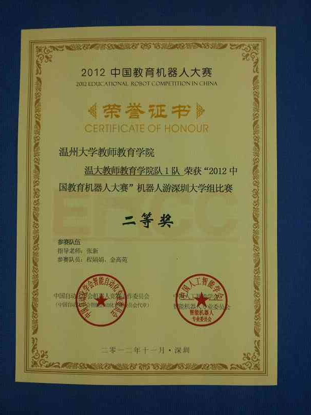 11月24日-25日,由中国自动化学会机器人竞赛工作委员会与中国人工智能学会智能机器人专业委员会联合主办的“2012中国教育机器人大赛”在深圳大学体育馆举行。在有全国50多所高等院校参赛、强手如林的比赛中,由我院张新老师指导的学生阮萤、傅巧玲、薛梦如、李瑶组成的温大教师p站视频