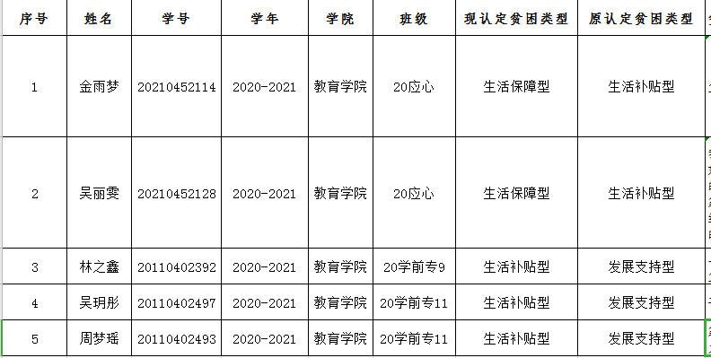 根据学校学生处发布的2020年《p站视频 家庭经济困难认定办法》文件通知,经班主任重新召开班级贫困生民主评议小组会议,p站视频 5人拟调整对应家庭经济困难档次。具体如下: