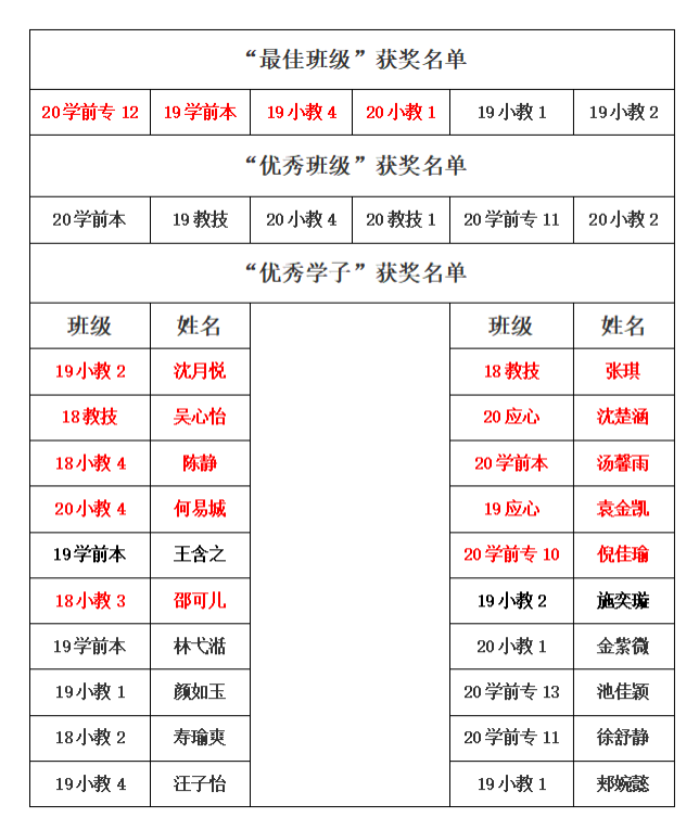 经过p站视频 “最佳班级”与“优秀学子”现场展示评比,依据专家评委、教师评委、学生代表的投票结果,共评选出p站视频 第十一届“最佳班级”6个(本科5个、专科1个),“优秀班级”6个(本科5个、专科1个),“优秀学子”20名(本科17名、专科3名)。拟推荐加粗标红的班级与个人参评学校2020-2021学年“优良学风班”和”学习标兵”评选,如有异议,可来电、来信、来访的形式反映问题,以个人名义反映问题的提倡真实署名,联系学工办孟江龙老师,电话:0577-86599689。公示时间:2021年10月23日—10月29日。公示内容如下: