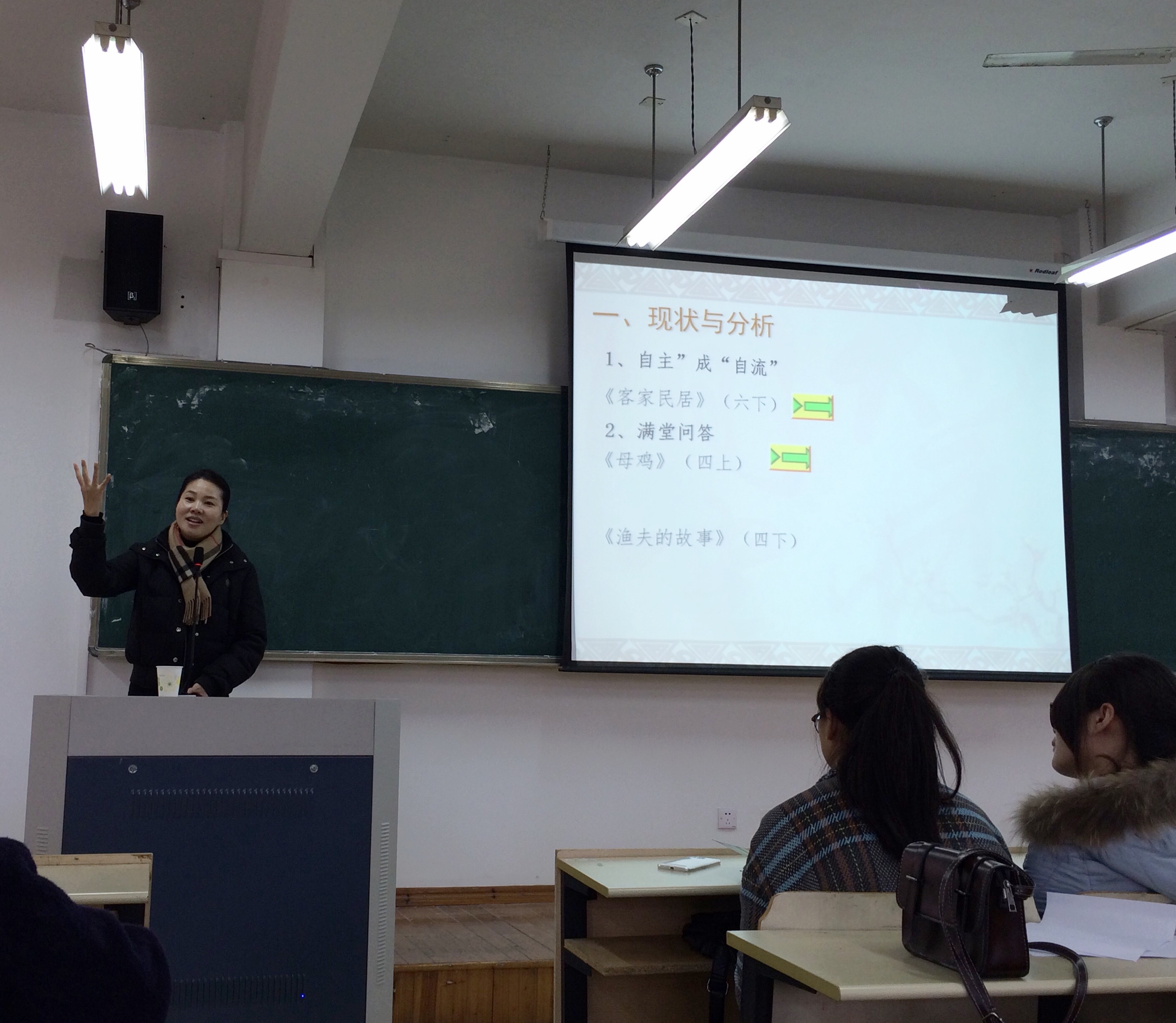 首先,林老师从课文的现状与分析入手,通过引用《客家民居》、《母鸡》、《渔夫的故事》三篇课文,分别提出了在教学过程中经常出现的“自主”成“自流”,满堂问答以及贴标签式的情感、态度和价值观这三个问题,并且强调在教学过程中要时刻铭记语文教学的特点,即工具性和人文性的统一。接着,林乐珍老师强调要根据学生的需求调整教学模式,并且列举典型课文,提出要在所给的教材中积极开拓新的内容。此外,林老师还提到在教学中,感悟、积累、技能三者要协调统一。最后,林老师送给大家这样一句话:“赋予扎实、灵动的韵律,赋予灵动、扎实的根基,扎实、灵动地进行语文教学。”
