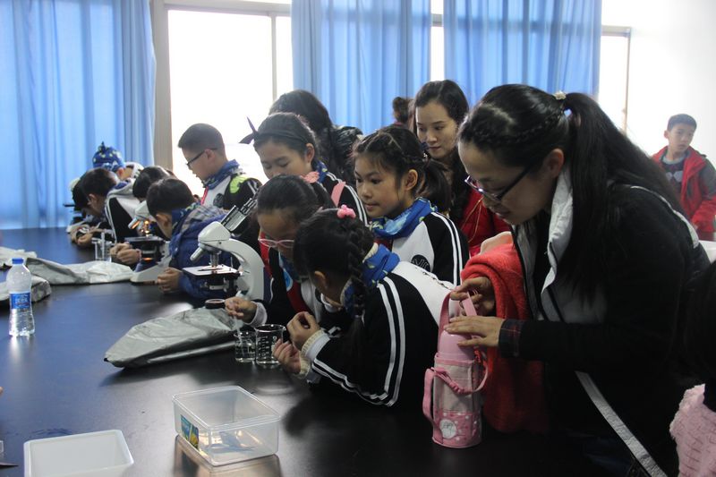 在实验室里,小学生们认真听取各实验室负责老师的讲解,老师和志愿者带领小学生逐一体验了各个实验室的教具,孩子们不时提出疑问,或驻足观看,或侧耳倾听,或踊跃参与,或互动交流。在自然科学室里,他们观察显微镜下的神奇世界;机器人实验室里,他们体验了智能机器人夹取、移动、投篮等运作全过程;在未来课堂实验室,他们体验了先进的教学媒体在教学中的应用。整个活动十分愉快,教室里回荡着阵阵笑声,直到下午3点小学生们才离开。实验室开放活动有效地利用学校资源,让孩子们体验了各种实验教学仪器,激发了他们对科学知识的兴趣。
