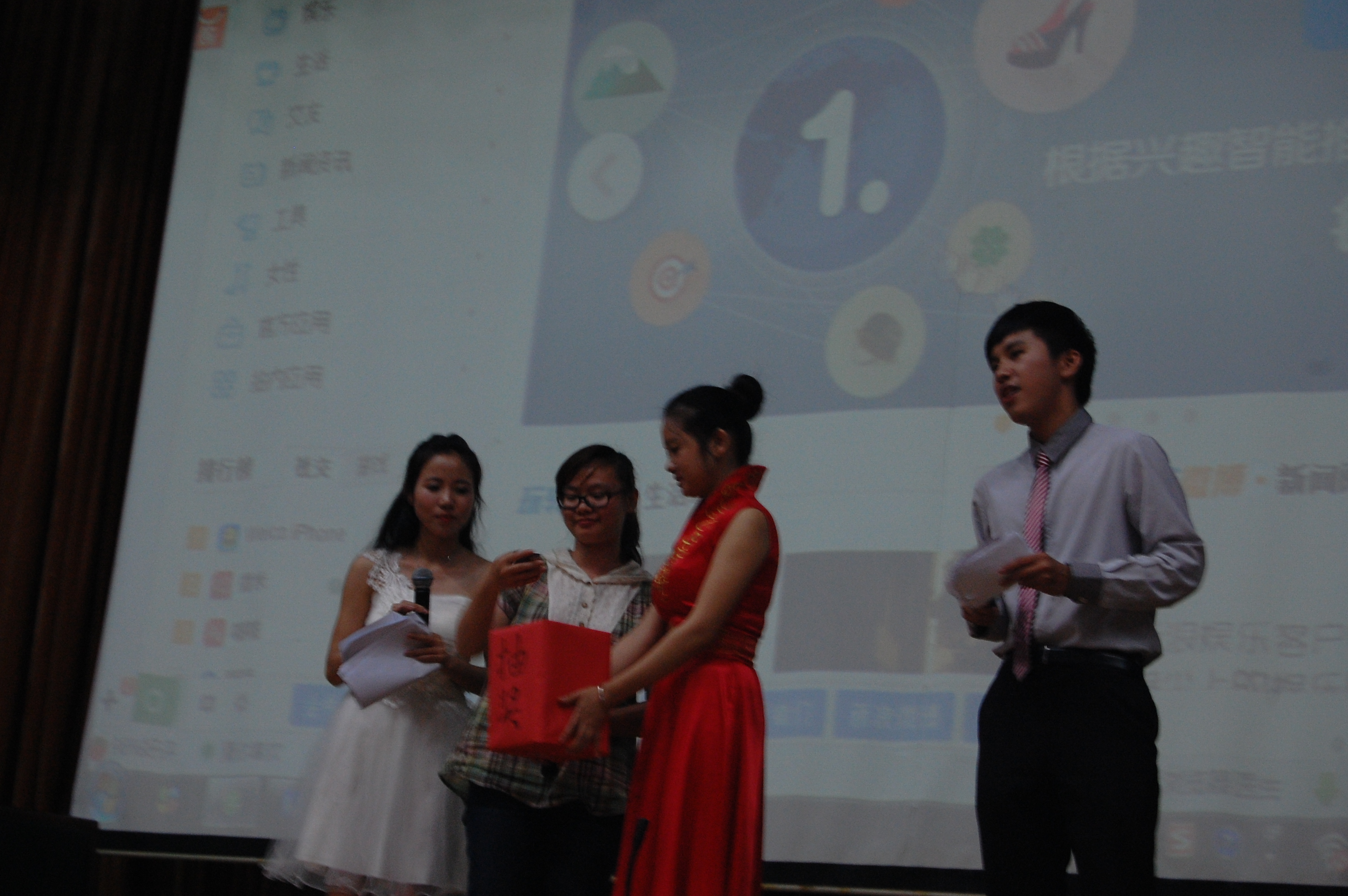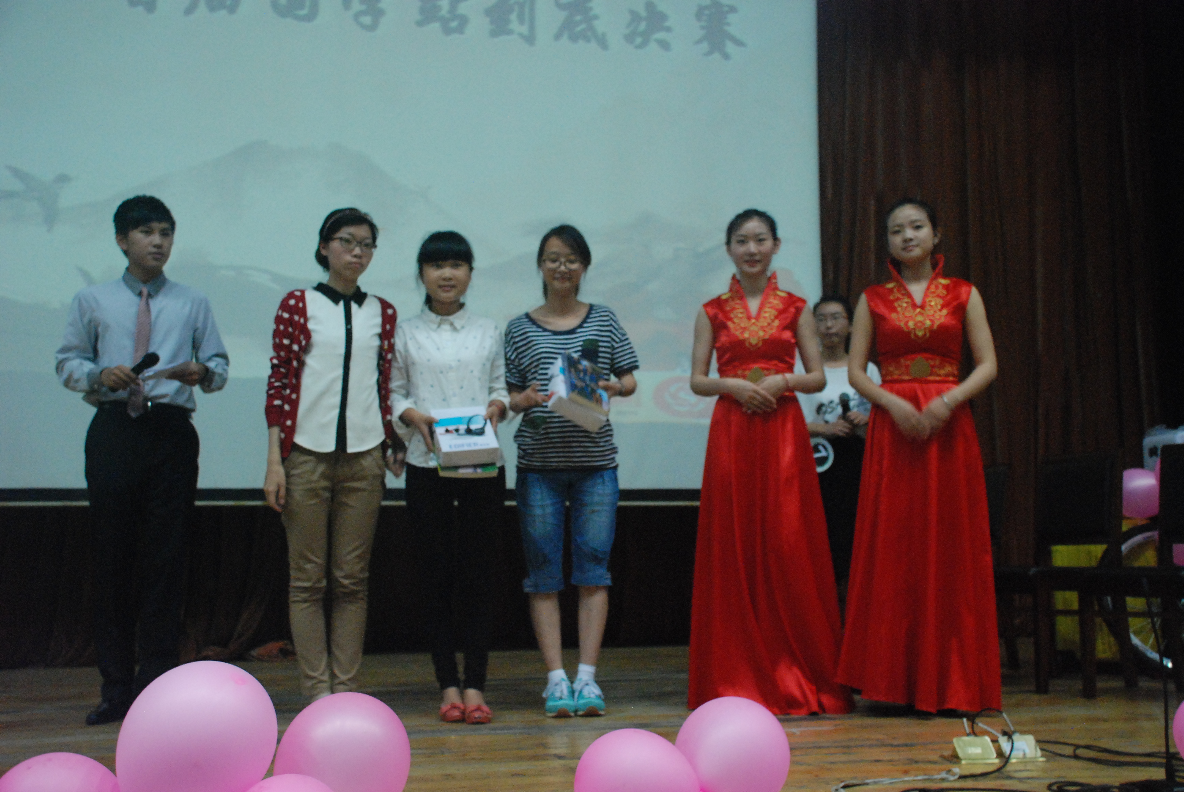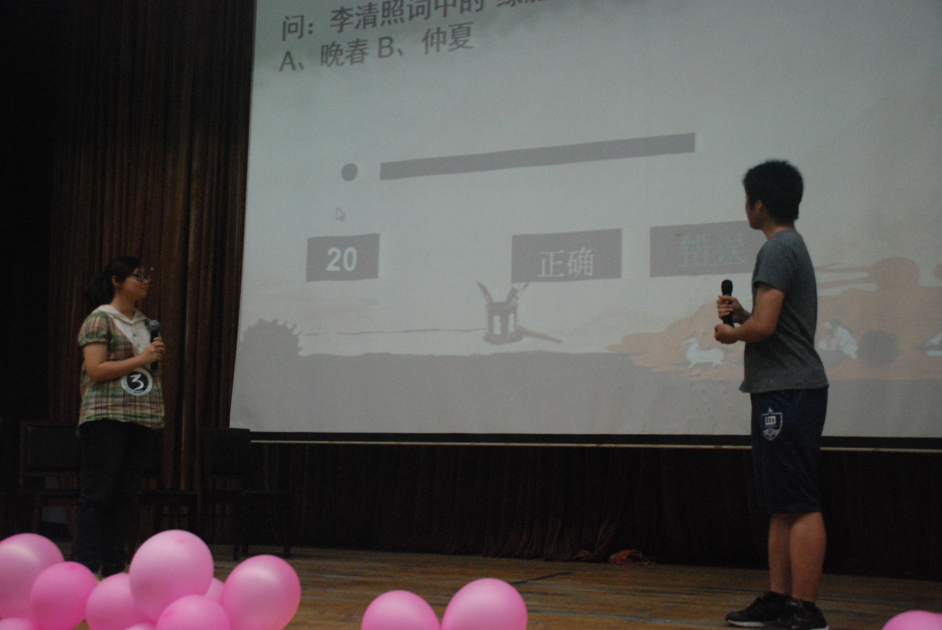 激扬热烈的开场舞之后,主持人进行了环节介绍。参赛选手们进行了各自的奋战宣言后,比赛正式拉开了序幕。其中,12号选手机智敏捷,博学强知,巧达的言辞引来阵阵掌声和喝彩,对手不得不甘拜下风。6号选手的谦逊虚心,也让我们深深折服。10号选手虽为理科生,却对国学情有独钟,剑一般的抢答,精炼的言辞,让我们印象深刻。选手的抢答,对手的速辨,主持人的报题速度也望尘莫及,足已可见他们对国学的熟悉度,偏僻的题目,他们口中自然而脱的答案,台下的我们发出深深的赞叹和崇拜。过五关斩六将,最终3号选手周依婷摘取宝冠,赢取丰厚大奖。选手们精彩的答辩环节后,迎来了激动人心的抽奖时刻,大奖的丰厚,观众的尖叫,现场气氛如燃烧的一团火般热烈。终极大奖环节部分,擂主3号选手在“终极五道题”中略败于第四题,与大奖擦肩而过,最终大奖花落于幸运观众,台下泛起阵阵激动的浪潮。比赛也在阵阵欢呼声中徐徐落幕。