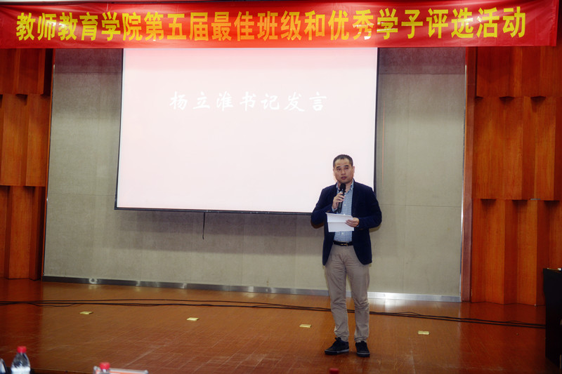 杨立淮书记致辞。他简要介绍了活动内容和意义,指出学院通过最佳班级和优秀学子评选这一品牌活动来加强院风学风建设,使大家能够互相学习,彼此激励。