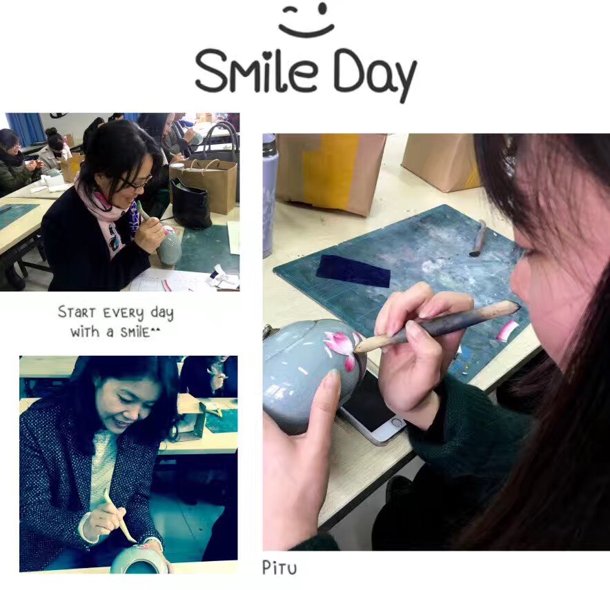 活动一开始,陈铿老师先向大家简单介绍了瓯塑的工艺特点和制作手法,然后每位老师领到了一个青瓷罐子和需要的瓯塑材料与工具。制作的第一步是在在青瓷罐子上描上图案,第二步是在图案上涂上胶水,第三步是选取瓯塑的特殊材料——油泥,第四步是把油泥揉搓成需要的形状,第五步是把揉搓好的油泥粘到罐子上,然后用特殊的工具压制、定型,一件美丽的彩色浮雕作品就完成了!接下来只需把它放在阴凉干燥处阴干就行了。在制作过程中,有的老师是在陈铿老师手把手的指导下完成的,有的是独立完成的,也有的老师比较有想象力,别出心裁地进行着自己的创作。最后制作出来的作品虽然还显得稚嫩,但全都色彩鲜艳,别有风采。