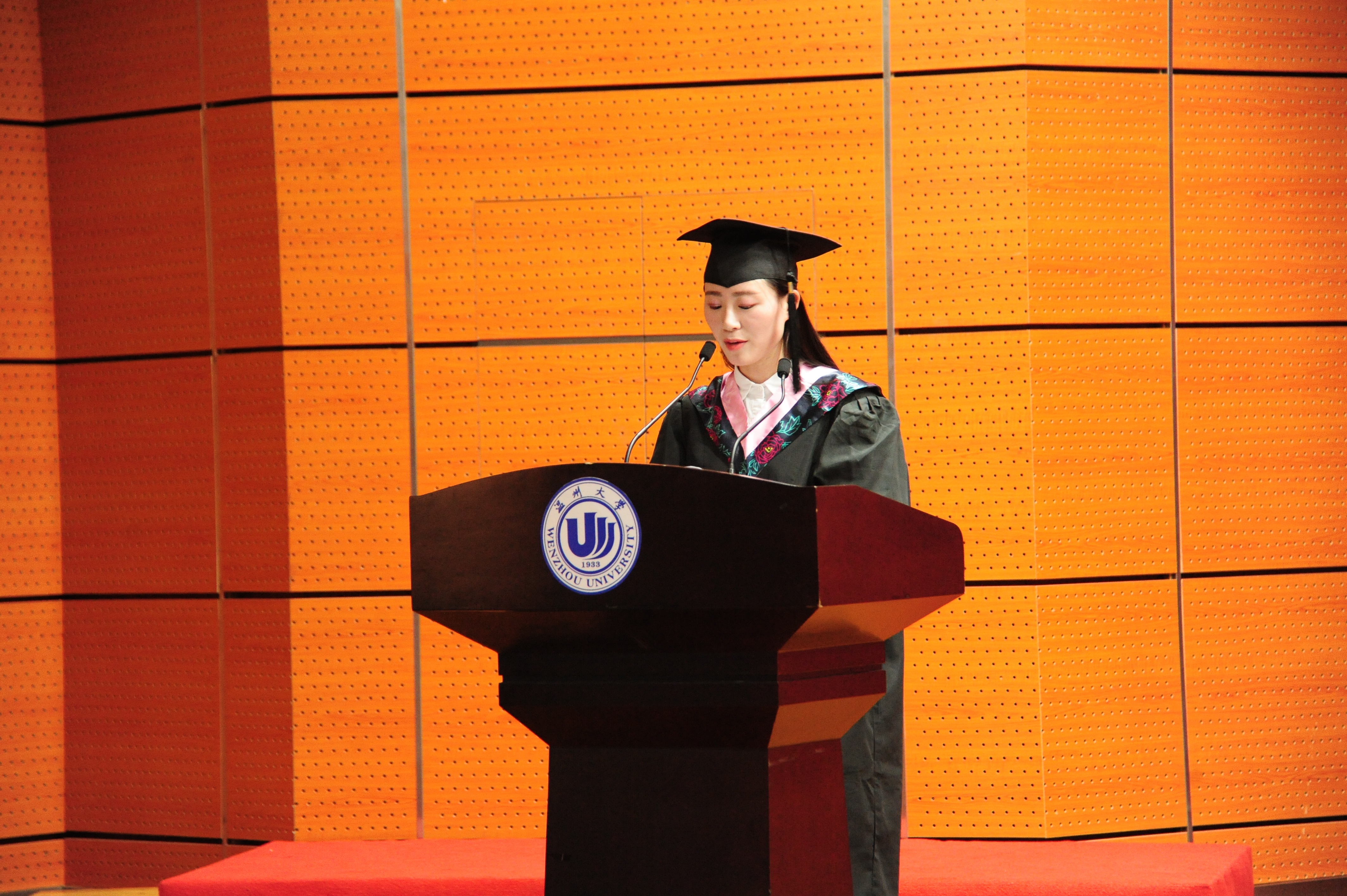 的全体老师表示衷心的感谢。她由衷地感叹大学生活中自己和身边同学的成长蜕变,以及这些蜕变背后的辛勤努力和酸甜苦乐。黄杨丽表示:“大学的意义,不在于拿了多少奖,或是在学生会做到了主席,而是这背后鲜为人知的付出和突破,是那些塑造了全新的自我的蜕变。” 怀着对母校的感激,全体毕业生在黄杨丽同学的带领下,进行了庄严的毕业宣誓仪式,表达了发扬学校“求学问是,敢为人先,厚培德本,深濬智源”的办学精神和学院“博爱雅艺”的师范气质,谨遵师长教诲、坚持师者仁道、肩负社会使命、报效祖国人民的远大理想和坚定决心,响亮的誓言见证每个毕业生即将在基础教育的沃土上绽放更加美丽的青春。