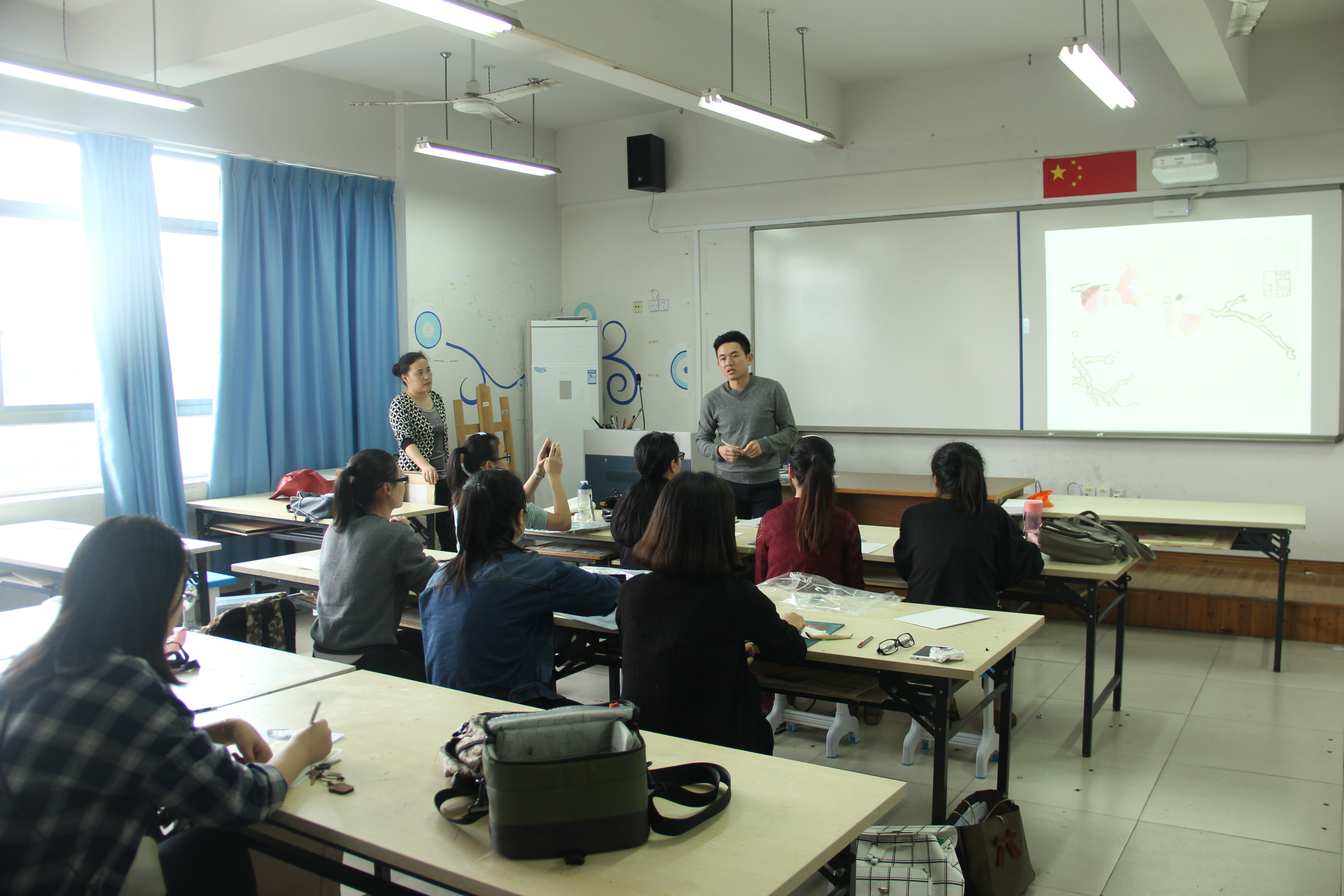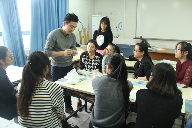 首先杨老师为瓯塑进行了详细的讲解。杨老师提到的以纯天然原料、纯手工创作的瓯塑艺术,有“东方立体油画”之称。它既是国家非物质文化遗产的瓯塑,还是浙江温州独有的民间艺术和汉族传统工艺美术品之一,至今有1000多年的历史。因为瓯塑具有构图自由,层次清晰,色彩丰富明快,技法繁多,立体感强的特点,加之它题材广泛,规格不限,所以被广泛应用于建筑浮雕、壁画、装饰图案及艺术挂件等中。杨老师以北京人民大会堂、北京中南海、杭州雷峰塔、浙江省人民大会堂等企事业单位为实例,给同学们更加直观清晰的感受,瓯塑艺术源于生活,并且也服务于生活。