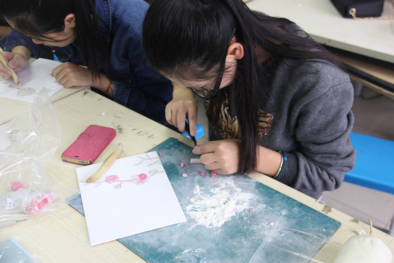 瓯塑历史源远流长,瓯塑制作的方法也别具一格。开始时杨老师让同学们先凭着投影仪上的梅花画,先白描梅花轮廓,之后再粘上胶水,采用瓯塑特有的压花法,揉搓彩泥混合均匀之后堆塑到画板上,通过工具多次修改,逐渐形成。课中杨老师亲子自动手制作压花,他的一搓一揉一捏一压,他细致谨慎的步步讲解,熟练精到的操作,让学生们更加深切体会到瓯塑艺术的精美绝伦。无怪乎,瓯塑艺术会受到敬爱的周总理、陈毅元帅夫妇、尼克松总统和艺术巨匠的高度赞誉。