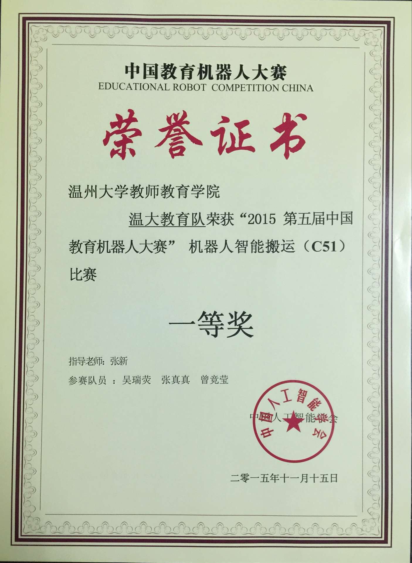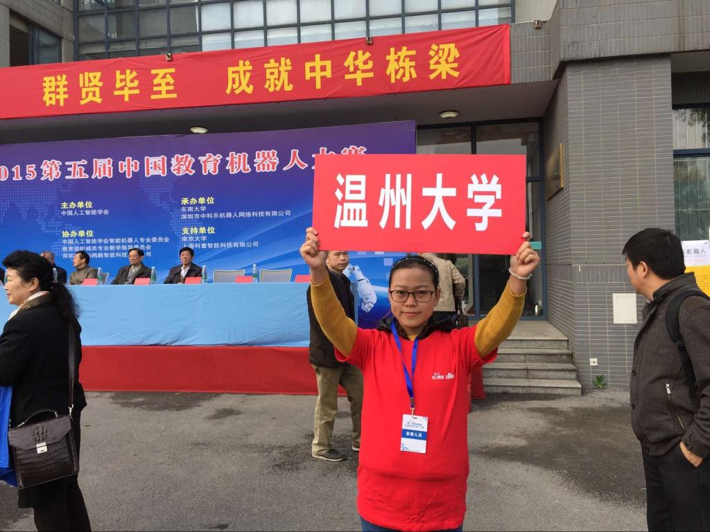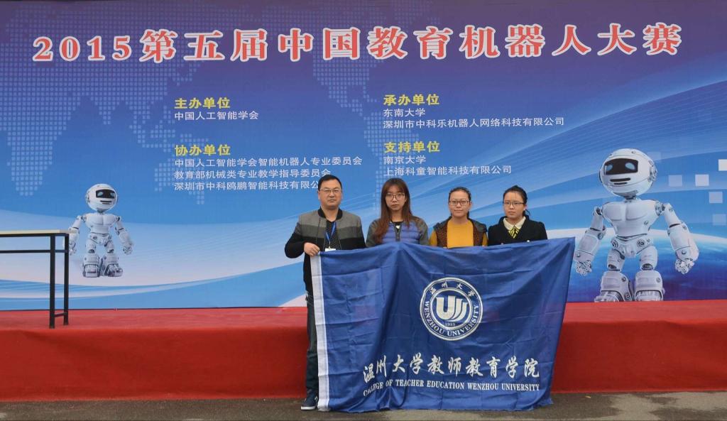 2015年11月14-15日,由中国人工智能学会主办的第五届中国教育机器人大赛在南京东南大学举行,参赛的有来自全国大中院校的200多支队伍。在比赛的两天时间里,分别进行了机器人智能搬运(C51)、机器人创意设计、机器人擂台、机器人搬运码垛、机器人灭火、机器人游中国等比赛。由张新老师指导的,我院小学教育系12科学班的吴瑞荧以及13数学班的张真真、曾竞莹组成的p站视频 教育队不畏强手,奋勇拼搏,取得“2015中国教育机器人大赛”智能搬运比赛(C51组)一等奖的佳绩,为学校争了光!
