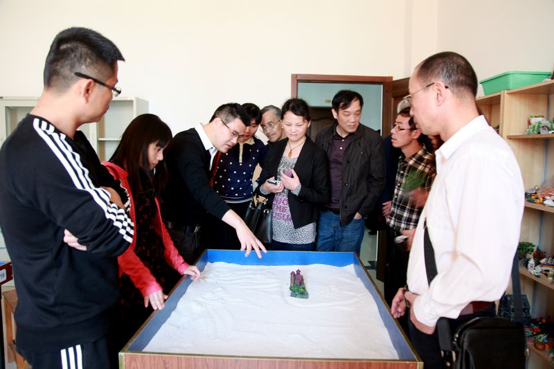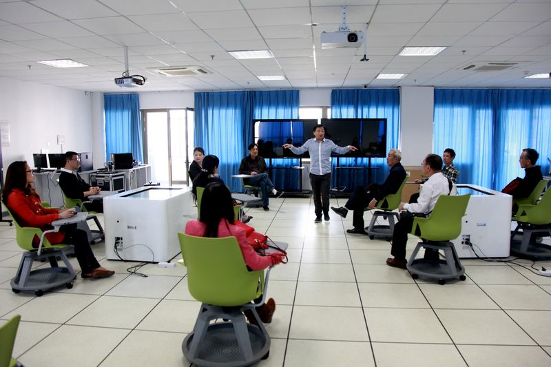 在学院领导的陪同和实验中心教师的详细解说下,教师们重点参观了沙盘演练室、眼动实验室、信息化教学设计实验室、蒙特梭利教学实验室。沙盘演练室内他们认真听着胡瑜副院长的解说,表现出浓厚的兴趣;信息化教学设计实验室的未来课堂也深深地吸引着他们,他们随意而坐饶有兴趣地听着叶新东主任的介绍……