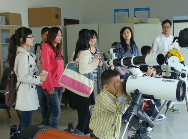 随后,队伍来到了自然科学观察室,大家迫不及待地使用显微镜观察起动植物细胞,有些孩子们在同学们的协助下一起进行了动物血细胞贴片的制作,从中感受自然的生命力和科学的力量。而在使用天文望远镜时,大家通过一块小小的镜片,清晰地观察远处的山水花草,虽然没有星星可以观察,但是其中的科学滋味儿都以被充分体会。在离开前,大家在心理实验室里运用仪器进行了反应测试,体会到做事时集中注意力的重要性。