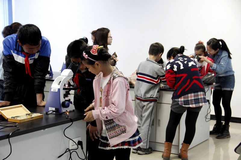 此次活动共开放5个实验室,分别是蒙特梭利教学实验室、感觉统合实验室、自然科学实验室、心理实验室、沙盘演练室。上午9:30两所学校近40位小朋友在老师的带领下到达北校大门,他们就像一群快乐的小精灵集合在校门口,我实验中心老师和学生志愿者在门口负责接待,按照自愿原则将其分为5组,每组由一位志愿者引领他们参与每一项活动。刚到实验中心,面对陌生的环境,他们表现得有些不自在,但实验室各专业指导老师温暖的笑容,关切的眼神,贴心的问候驱走了他们内心的不安。你看,自然科学实验室内有一双双求知的目光,他们认真听着老师的每一句解说,亲眼感受显微镜下奇妙的微观世界;感觉统合实验室里更有他们的欢声笑语;沙盘演练室他们小组合作创设自己心目中的理想世界,有城堡、有沙滩、有原始森林、有幸福家园……