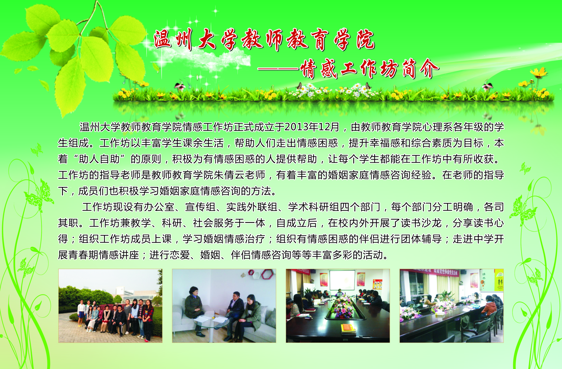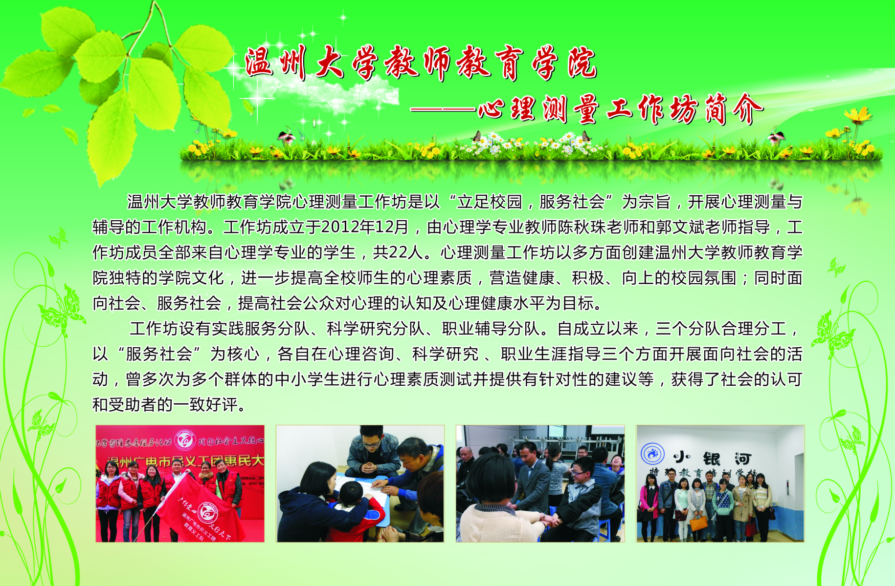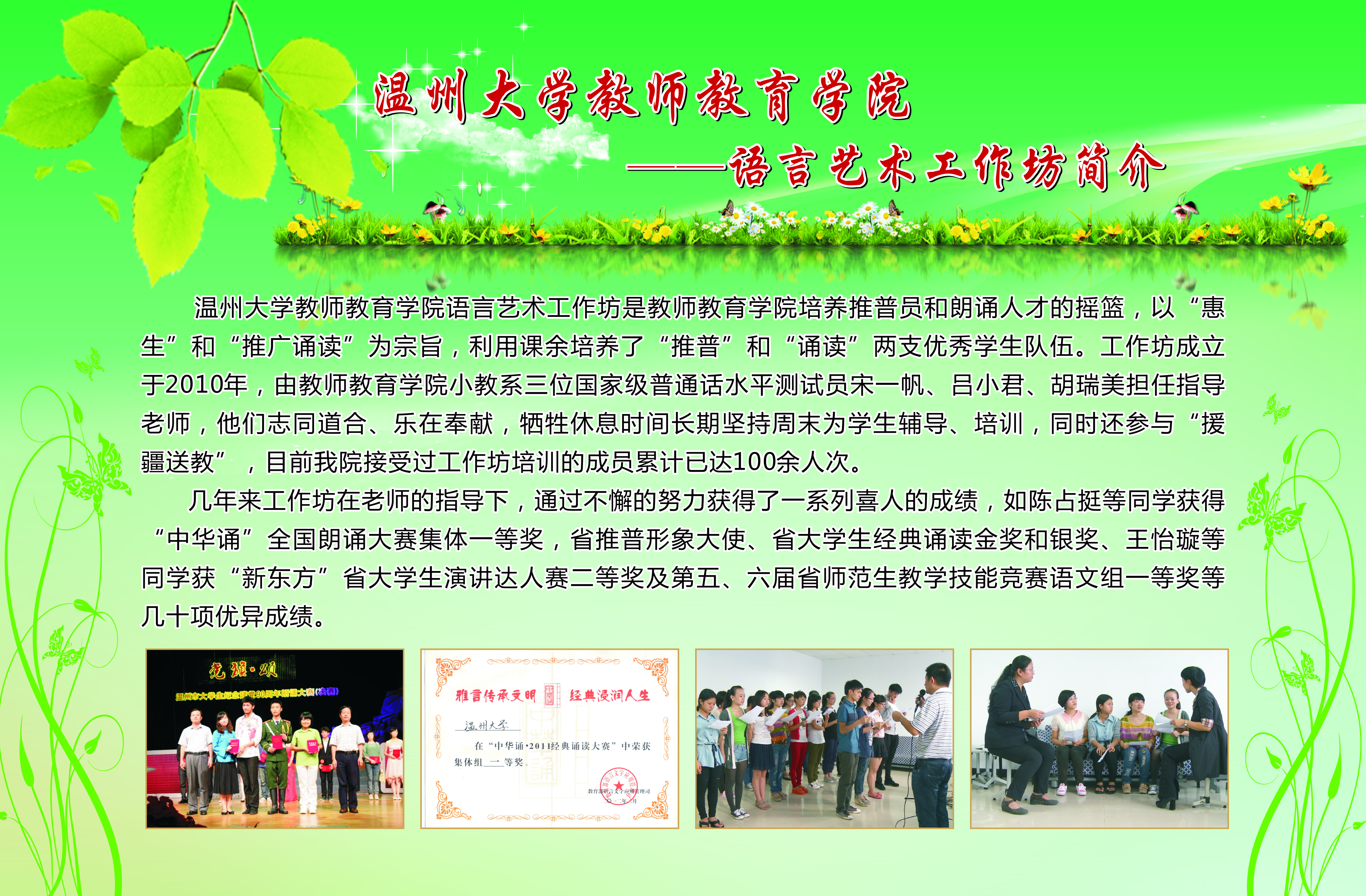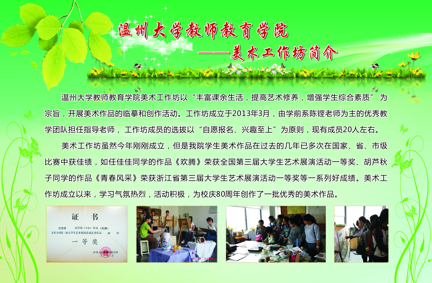 学生工作以培育学生“博、爱、雅、艺”师范气质,深化学院优良学风建设,提升学院服务地方的能力为宗旨,创办了一系列的学生专业工作坊。从09年开创至今,学院工作坊数量逐渐扩大,目前已拥有语言工作坊、儿童剧剧社、书法工作坊、合唱工作坊、新媒体工作坊、软件工作室、摄影摄像工作室、表演唱工作坊、心理测量工作坊、美术工作坊、舞蹈工作坊、文学创编工作坊、情感工作坊等13个学生专业工作坊。为进一步推进我院学风建设,发挥先进典型的示范作用,展示我院师生在“博、爱、雅、艺”方面的精神风貌,我院特举办此次学生专业工作坊宣传展。