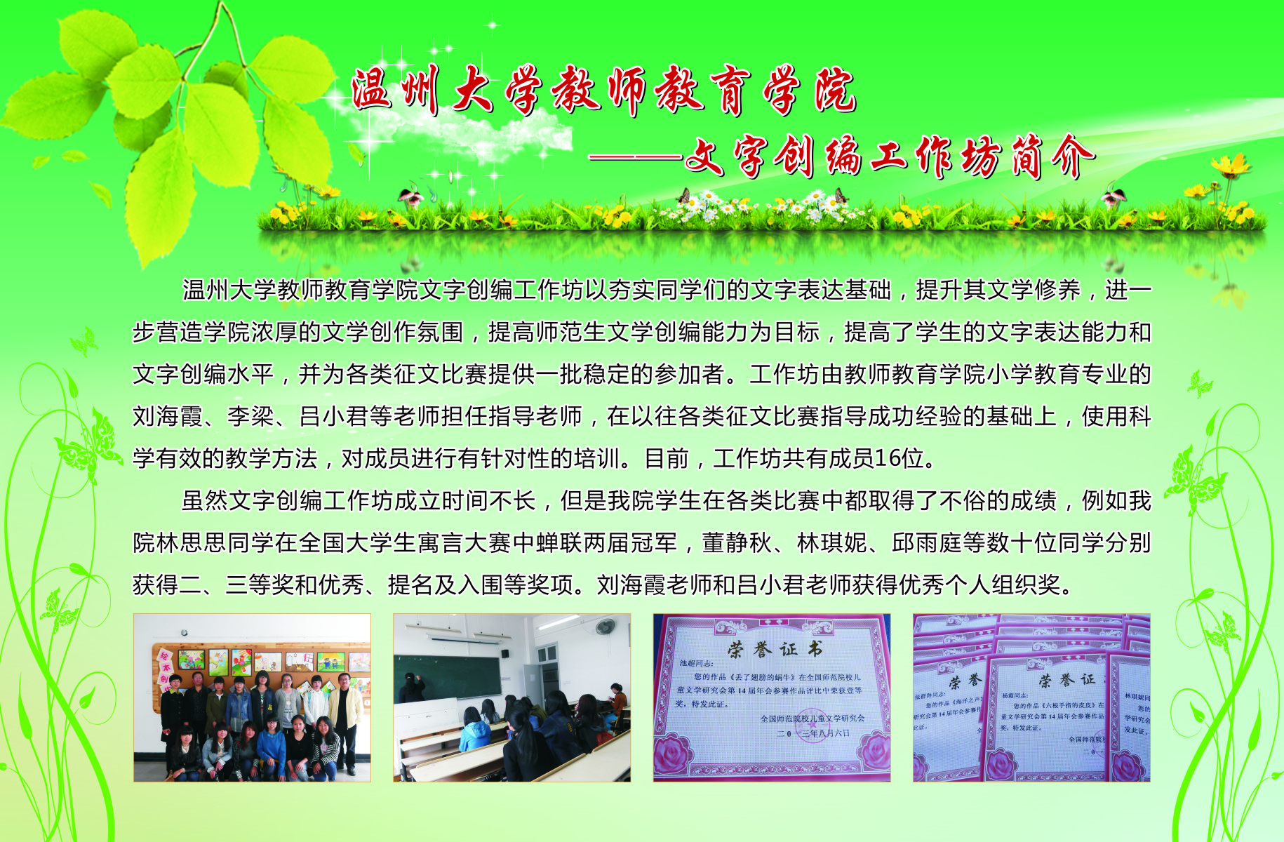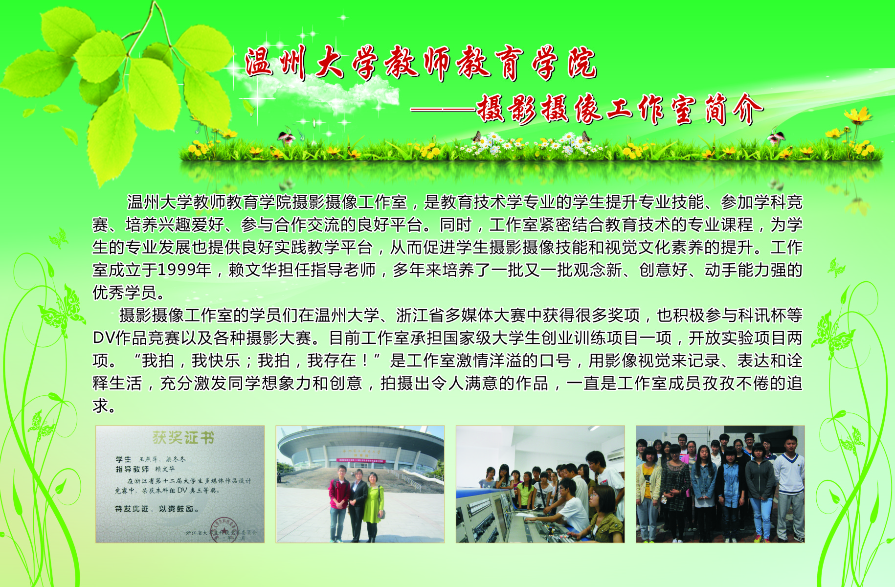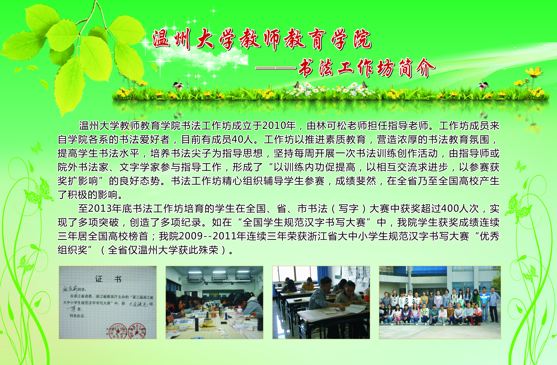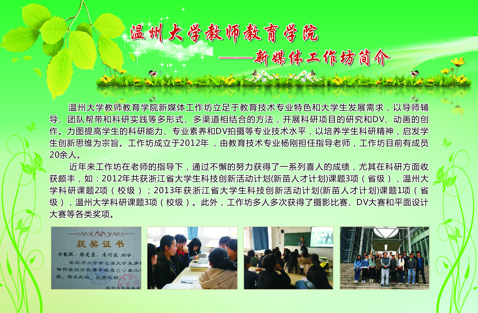 学生工作以培育学生“博、爱、雅、艺”师范气质,深化学院优良学风建设,提升学院服务地方的能力为宗旨,创办了一系列的学生专业工作坊。从09年开创至今,学院工作坊数量逐渐扩大,目前已拥有语言工作坊、儿童剧剧社、书法工作坊、合唱工作坊、新媒体工作坊、软件工作室、摄影摄像工作室、表演唱工作坊、心理测量工作坊、美术工作坊、舞蹈工作坊、文学创编工作坊、情感工作坊等13个学生专业工作坊。为进一步推进我院学风建设,发挥先进典型的示范作用,展示我院师生在“博、爱、雅、艺”方面的精神风貌,我院特举办此次学生专业工作坊宣传展。