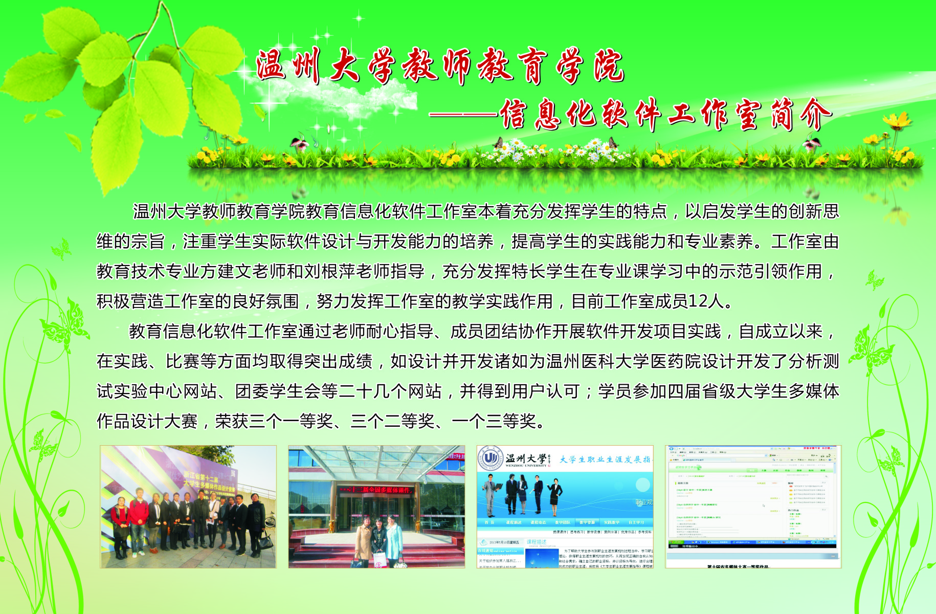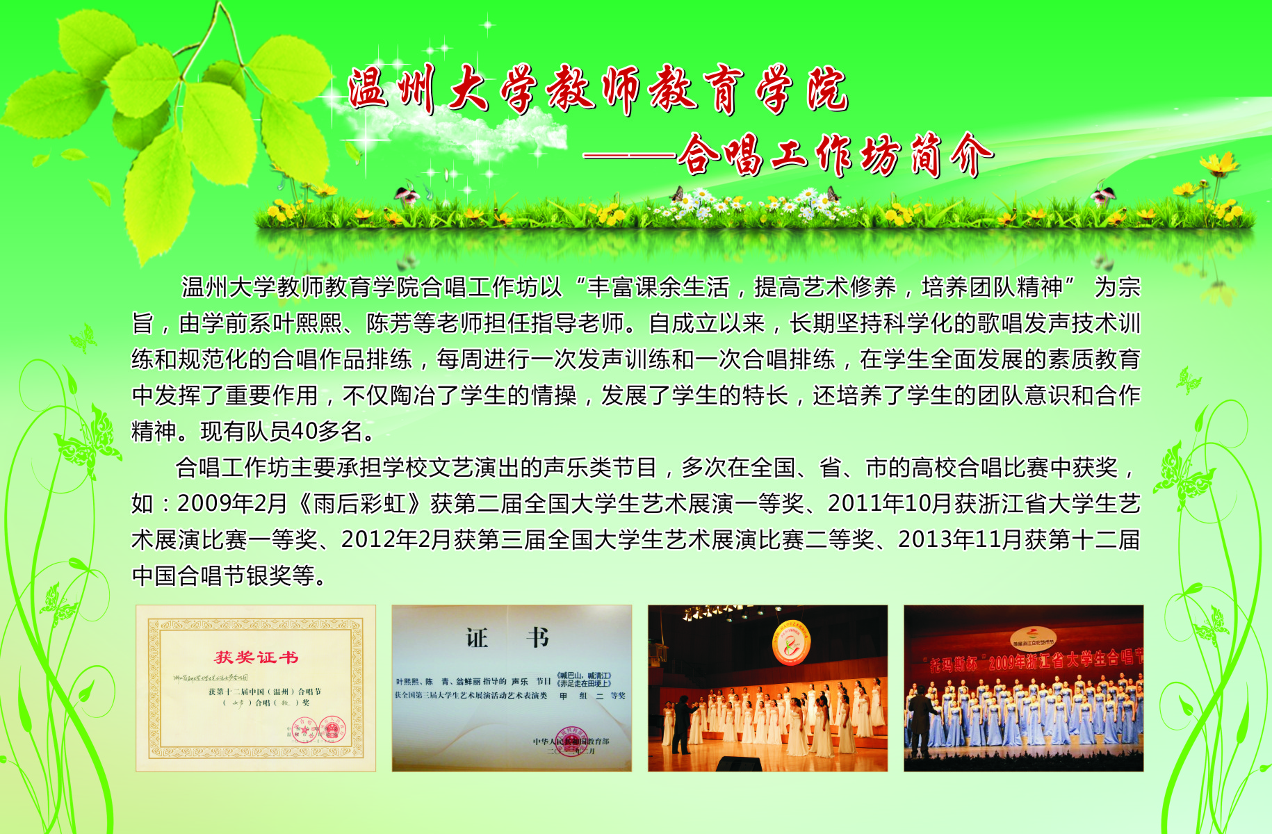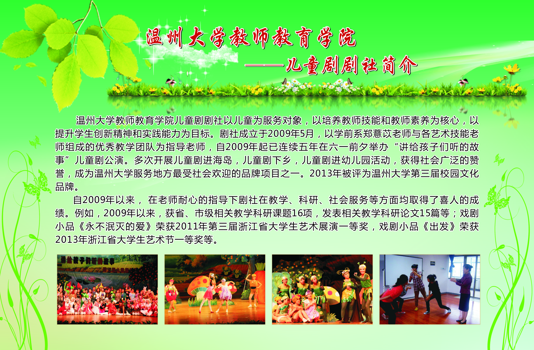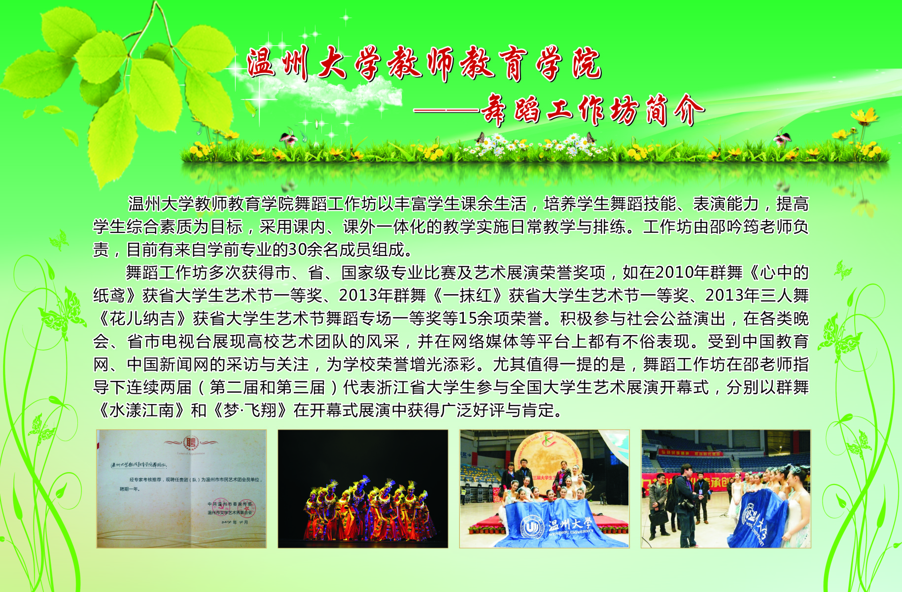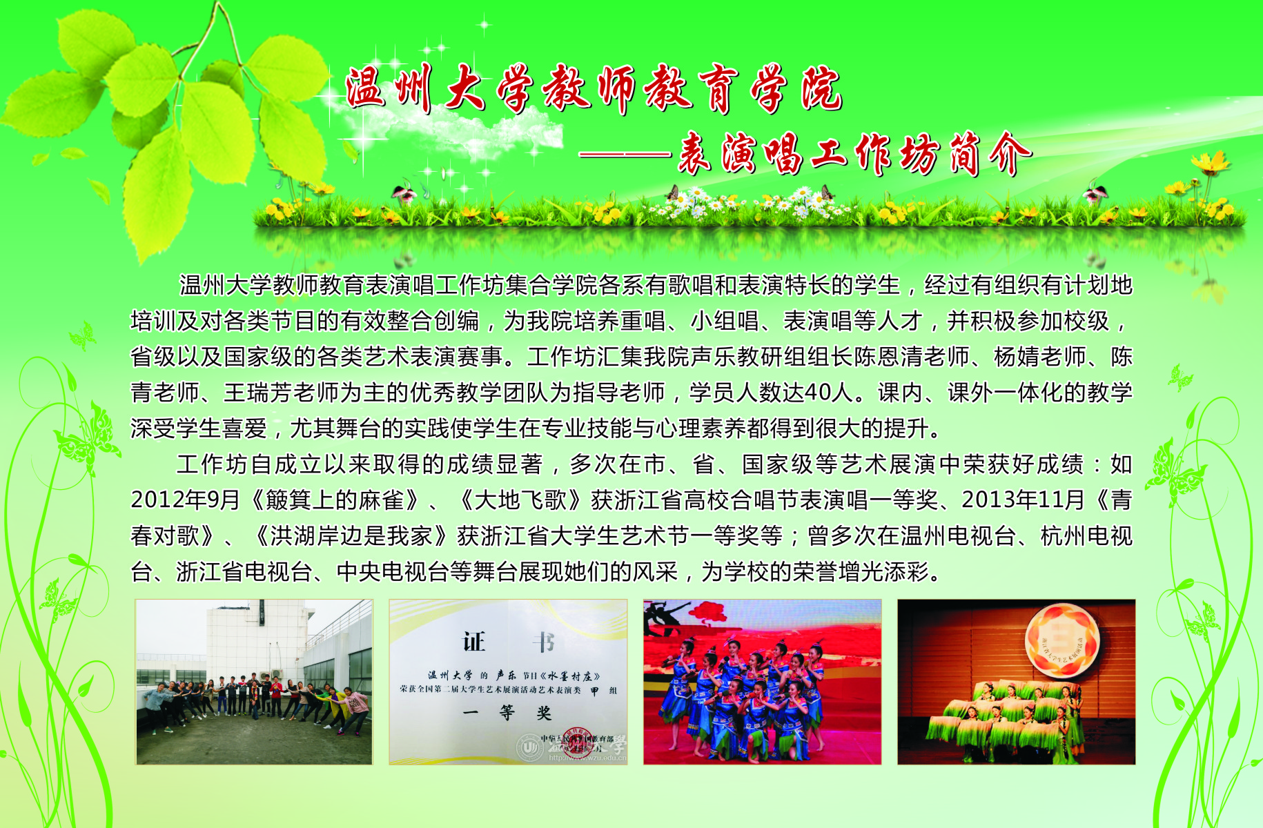 本次展览通过图片加文字的形式在南校宣传橱窗展出了我院13个学生专业工作坊的简介、师生合影、培训及成果照片等。学院专业工作坊在各位工作坊专业老师指导下,学生在自身综合素养及品质得到提升的同时,参与各类省市、乃至全国的比赛,扩大学校、学院的声誉。近三年我院学生在全国、省、市、校文化艺术大赛中个人获奖达687人次,并不断以儿童剧公演、心理测量等方式公益服务社会。