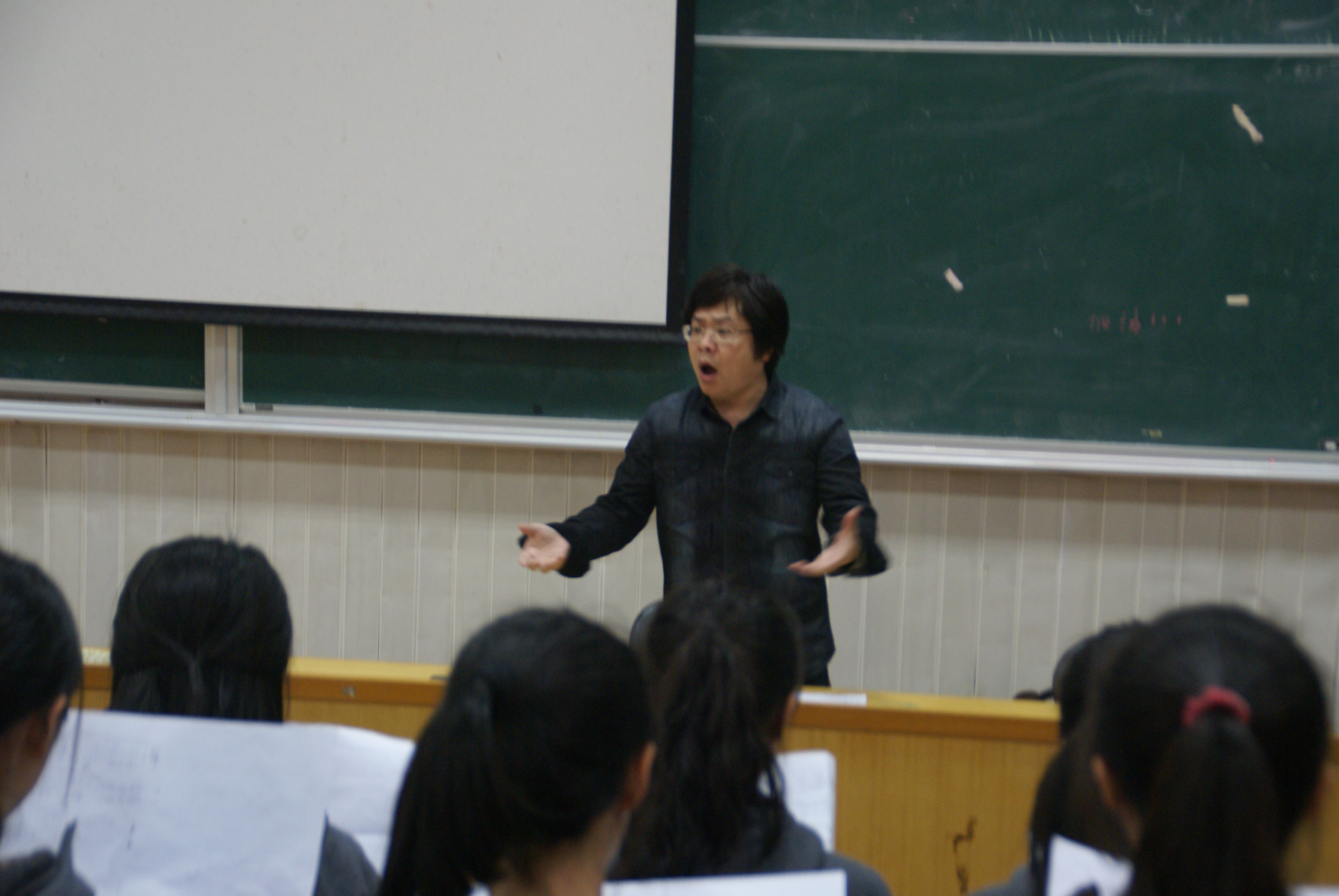 下午三点,叶熙熙老师刚刚结束温大教学任务,马不停蹄赶到乐清教学点阶梯教室,指导学生合唱排练。叶老师首先激情四射地演奏了合唱曲目《我爱祖国的蓝天》伴奏曲,学生席随即迸发出热烈的掌声,接着叶老师对每一个声部进行了分析,逐行逐句地精雕细琢,力求使声音准确,统一,平衡,特别强调《我爱祖国的蓝天》的情感处理和《葡萄园夜曲》的音色把握,在指挥过程中不忘引导学生学会看指挥手势,注意声音与钢伴之间的交流,互为映衬。叶老师的合唱排练生动、诙谐、易懂,真可谓深入浅出,大师风范,短短的一个半小时令师生们感受到了合唱的魅力,并对5月27日温州市直属学校的合唱比赛充满期待。