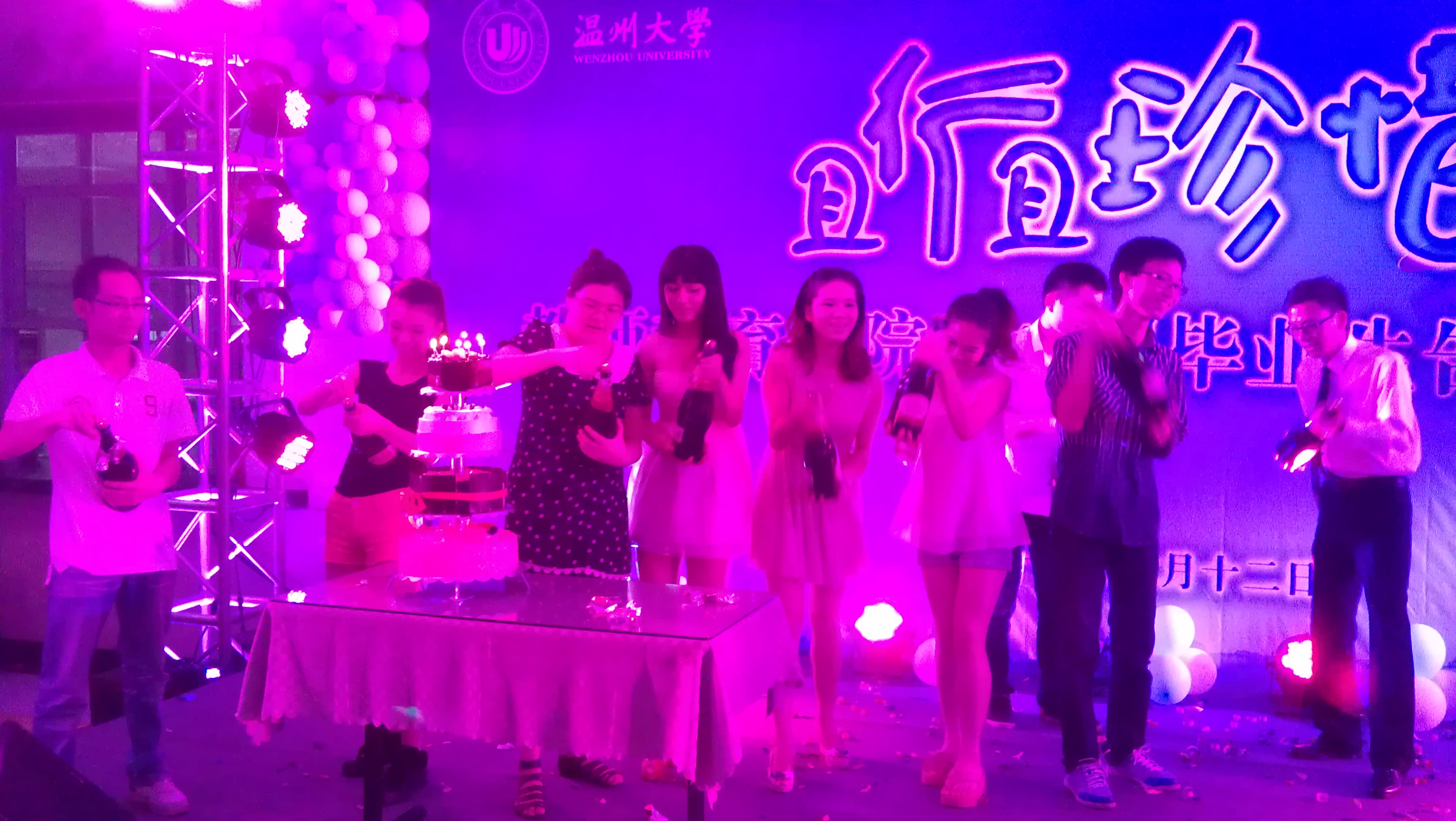 入席后,一段承载着学院领导、老师、学弟学妹殷切关怀与美好祝愿的DV短片拉开了活动序幕。郑信军院长真诚的祝愿致辞在大厅回荡,九个毕业班代表开启了象征友谊天长地久的香槟,点亮了祝愿今后一帆风顺 “我们毕业啦”的蛋糕。此刻的现场,流光溢彩,激情飞扬!所有毕业生以班级为单位齐声喊出了对母校的告别祝福:“我们毕业了,某某班级向母校告别,祝福母校……”,声音一浪高过一浪,许多同学激动地热泪盈眶。毕业意味着收获、成长,也意味着离别、珍重。今天,他们满怀着感恩的心,齐声向母校告别。