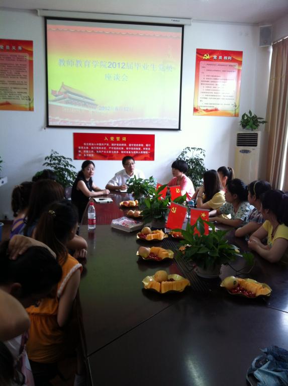 6月12日,我院分批召开了2012届毕业生党员欢送座谈会,中午12点30分在我院党员之家召开了学前教育专业、教育技术专业、教育学专业毕业生党员座谈会;下午1点50分在北校行政楼227会议室召开了小教专业毕业生党员座谈会。教师教育学院总支书记蔡联群、副院长彭小明、党总支副书记嵇小怡、小教系主任蔡志凌、小教系书记吕小君以及小教系党员教师出席了会议。会议由蔡联群书记主持。