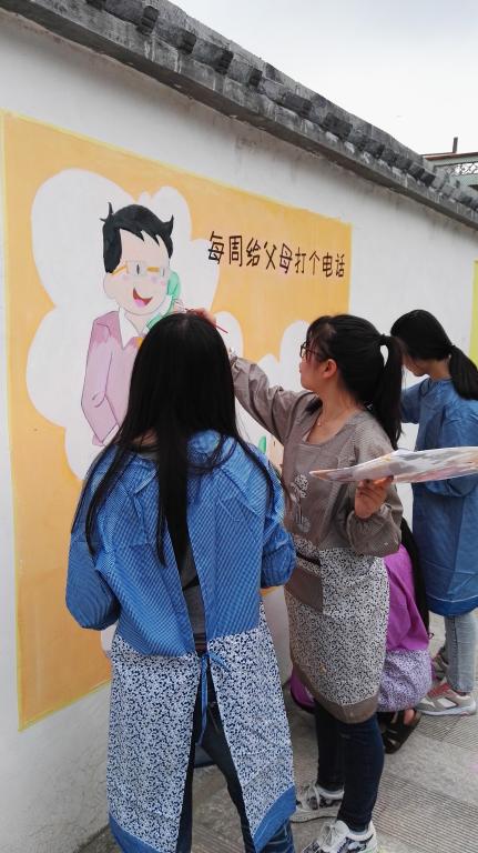 公益墙属于大乌石村中心休闲街外墙,村委会改造后重新粉刷。志愿者现场测量墙面尺寸,在空白墙面前纷纷进行排版设计和图绘勾画,进行长达5小时孝文化系列的绘制,得到当地村负责人的肯定和村民的赞许。