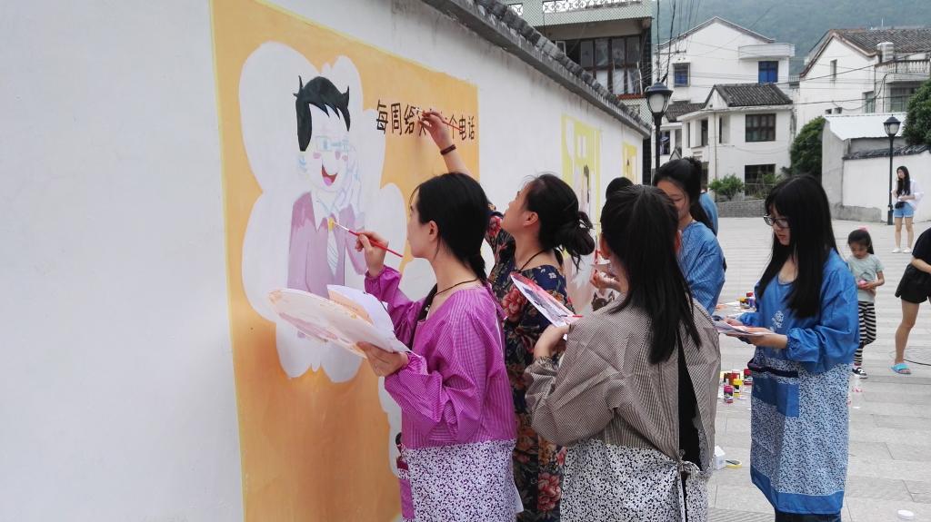 美术工作坊指导老师陈铿和学生科严晓秋老师带队,30余位学生志愿者,前往乐清虹桥镇大乌石村开展公益墙绘活动。