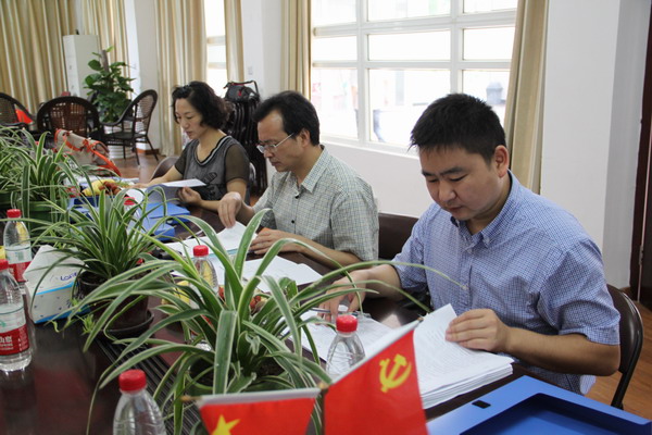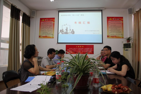 在蔡书记的主持下,考察工作开始。首先,考察组听取了院工会主席朱伟同志关于近三年工会工作的汇报。朱主席分别从“党政工共建”、“二级教代会制度、院务公开”、“围绕中心服务大局”、“工会自身建设”等四个方面向考察组进行了PPT汇报,并根据考核指标对我院的“教工小家”建设进行了自我评分。接着,考察组认真查阅了我院工会悉心准备的考核材料,并与我院党政工领导进行了深入的交流。在交流中,学院蔡书记和嵇副书记分别对学院的工会工作给予了充分的肯定,并向考察组补充介绍了我院“教工小家”建设中的一些特色品牌项目。