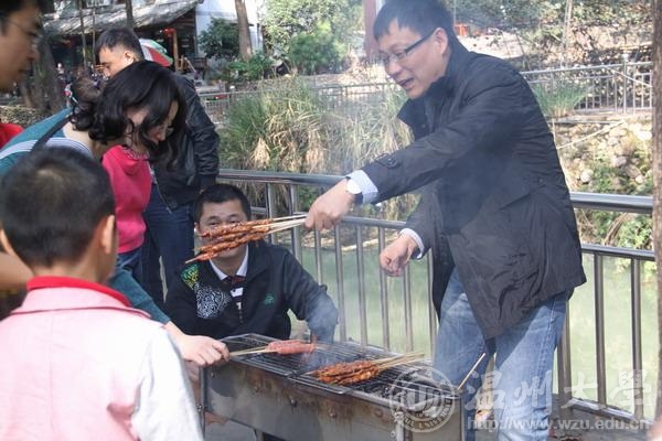 活动的主题虽然是“亲子”,但其实活动是开放的,同样欢迎单身的、不单身但不带家属或孩子的教工参加。今天天空作美,一扫前几天的阴雨,阳光灿烂,大家的热情也分外高涨。活动的第一站是永嘉碧莲香柚基地。这里的早香柚是远近闻名的,肉质多甜少酸,风味浓郁,质地松脆,有爽口清香,无苦味等优点。大家看到果树上金黄色的累累果实,都兴奋异常。经过一段时间的爬上爬下,一个个都满载而归。离开香柚基地,一行人来到楠溪江边的香樟园进行烧烤活动。这是今天活动的重头戏。四个烧烤架一字排开,放炭、点火、扇风,不一会儿,一串串香喷喷的羊肉串、烤鱿鱼、烤鸡翅等就新鲜出炉了。当然最开心的还是孩子们,他们在各个烧烤台间来回奔跑,品尝着、也交流着各种美味。吃饱后,孩子们还自发地玩起了跳绳、拔河等游戏。