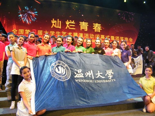 自接到参加此次全国大艺展开闭幕式的演出任务以来,学校、学院领导高度重视,全体参演学生在指导老师邵吟筠、杨婧的带领下全力以赴,利用节假日时间刻苦排练。校党委副书记牟德刚,校团委书记杨立淮,学院党总支书记蔡联群、副书记嵇小怡都到现场看望排练师生,亲切询问排练中遇到的困难,为师生们排忧解难解决后顾之忧。领导们的多次关怀,给参演师生带来了莫大的鼓舞,实践也充分证明了这一点,当《心中的纸鸢》在开幕式中亮相后,虽然演出才短短的1分40多秒,但给在场的观众留下了深刻的印象,并给邀请留下来继续参加闭幕式的演出;而表演《青春花开美山乡》的同学们把当代大学生积极向上、敢于担当历史使命的精神面貌,完美的演绎得到高度赞赏,充分展示了温大学子、教育学子朝气蓬勃、昂扬向上的良好风貌。