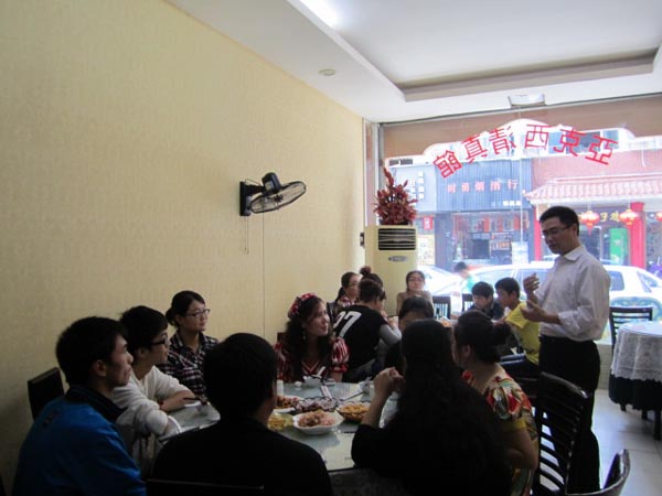 古丽巴哈尔和祖木来提为大家献上了热情的新疆舞蹈,艾克拜尔江与古丽巴哈尔的共舞将聚餐的热烈气氛推向了高潮。我院11应心班的团支书罗余军同学为大家高歌一曲,人文学院的两名新疆同学献上了动感、青春的热舞。在小小的餐馆里,一起来庆祝节日的穆斯林,也被我们欢乐的气氛所感染,为同学们的精彩表演热烈鼓掌。