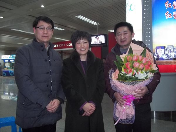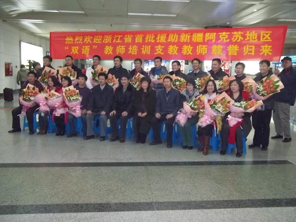 1月8日晚间,浙江省首批援助新疆阿克苏地区“双语”教师培训支教教师载誉归来。省教育厅副厅长何杏仁、省教育厅人事处长励如孟、师范处李敏强等领导莅临杭州萧山机场,迎接载誉而归的首批17名教育援疆教师,并一一为他们送上鲜花。我院党总支书记蔡联群老师也专程赶赴杭州迎接12名教育援疆教师之一的我校宋一帆老师。作为首批教育援疆的教师之一,宋一帆老师接受了省厅领导送上的鲜花和学院领导的慰问,并与省教育厅领导、学院领导合影留念。