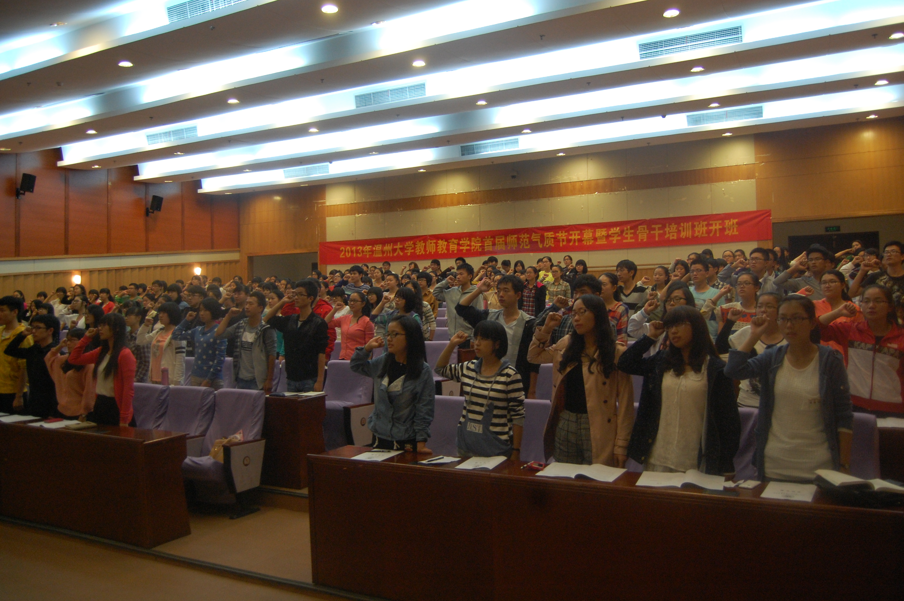 的所有学生骨干成为宣传、修炼以及推进师范气质节的楷模。郑院长热情洋溢、语重心长的一番话赢得学生热烈的掌声。第二项议程是嵇书记介绍师范气质节活动。嵇书记从师范气质LOGO、师范气质形象大使、师范气质宣传片、师范气质文化环境营造方案、“中国梦·我的教师梦”征文和“培育师范气质,争当卓越教师”演讲等8个方面对师范气质节做了简要的介绍。第三个议程是辅导员严老师介绍学生骨干培训班课程。严老师指出本届培训班的4个创新之处:首先,采取自愿报名的原则;其次,采用随机分组的方式;其三,课堂内容非常丰富;其四,聘任学生辅导员。第四议程是院学生会组织部王静宣读培训班考核及评优事项。本次会议的第五个议程也是最后一个是宣誓仪式。学生骨干们齐齐的举起右手,在王静的领誓下,认真庄严地读出誓言。本次气质节开幕式暨学生骨干培训班开班在学生的宏亮的宣誓声中成功地画上了句号。