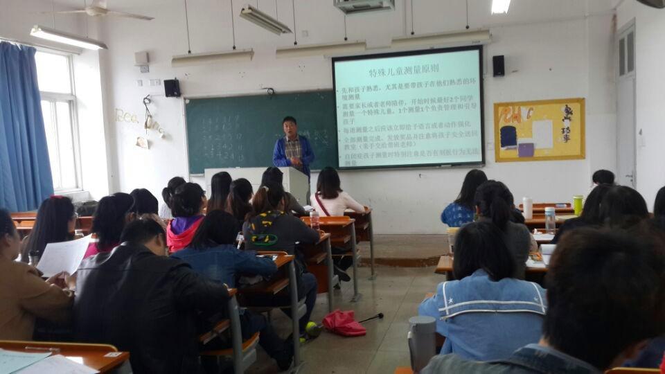 两位老师详细地讲解了对特殊儿童尤其是自闭症儿童和智障儿童进行测试的注意事项:首先,要注意排除有刻板行为的儿童;其次,要关注儿童的注意力是否集中在测验工具上;第三,要注意对特殊儿童在测试过程中及时予以适当的强化,鼓励他们能够继续进行测验;第四,最好选择特殊儿童熟悉的环境,并要求父母或者个训老师陪伴;第五,当遇到特殊儿童情绪不佳时,暂时停止测验,等其情绪平稳后再继续测验;第六,开始测试特殊儿童时,最好能够在观摩老师测验之后,两个同学一起配合完成测验,积累特殊儿童测验的经验。