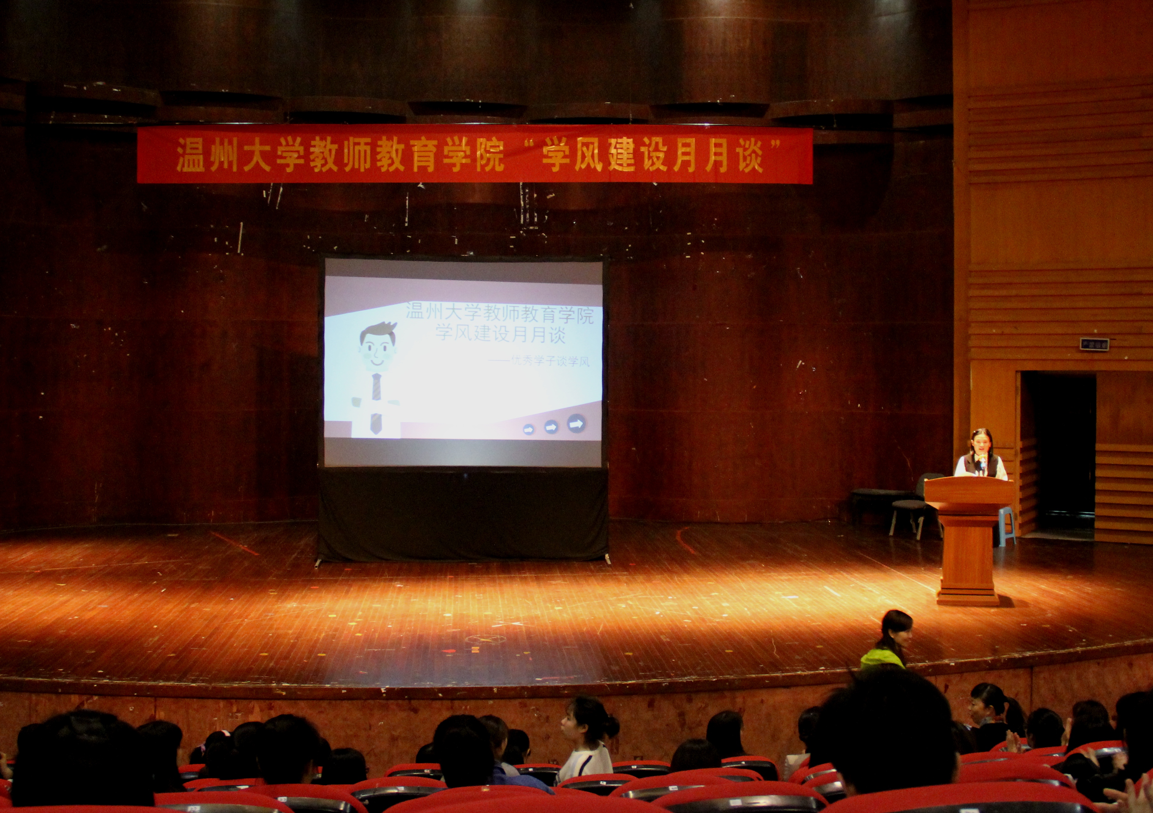 “学风建设月月谈”主题交流会在南校音乐厅拉开了帷幕。党总支副书记杨丽君老师、学前教育党支部书记陈旭微老师、学生科副科长林萍,辅导员严晓秋、邵胜男老师出席本次讲座,到场嘉宾和优秀学生代表共议学风那些事儿。