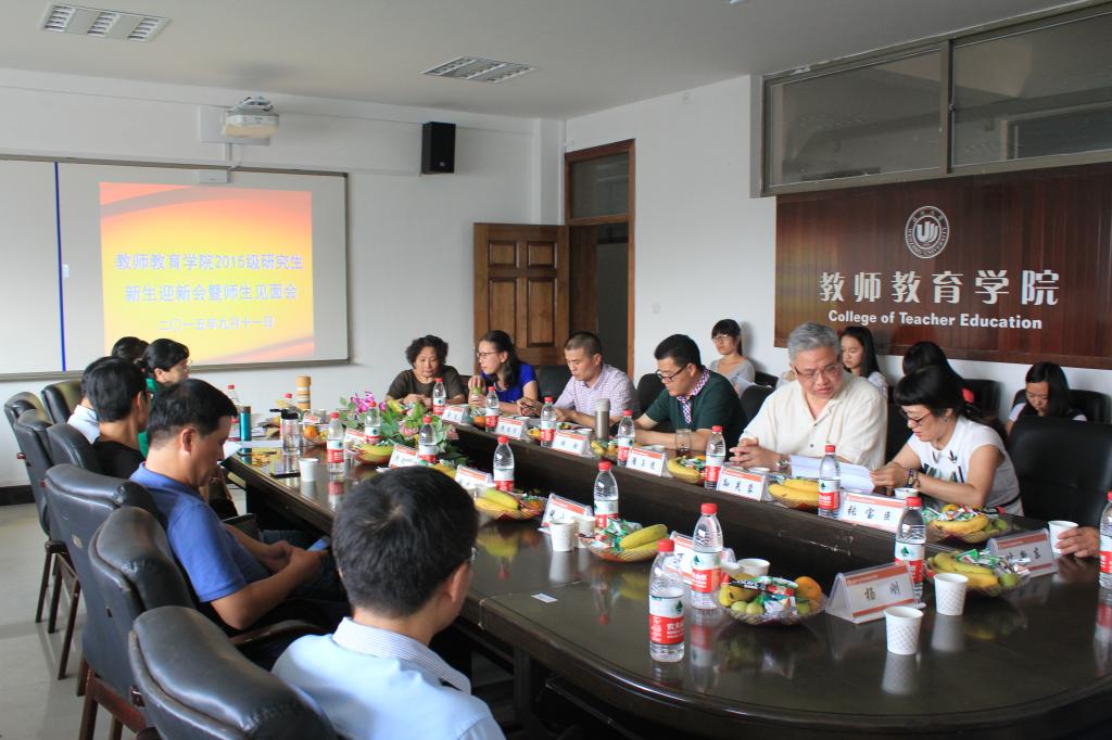 潘玉进副院长首先对15级新生的到来表示了衷心的祝贺与热烈的欢迎,同时也对我院的新生力量寄予厚望。在潘玉进副院长的主持下,各位硕导首先向新生简单介绍了自己的研究方向,各新生也介绍了个人基本信息和对研究生学习生活的展望。在师生之间有了基本的了解之后,各个