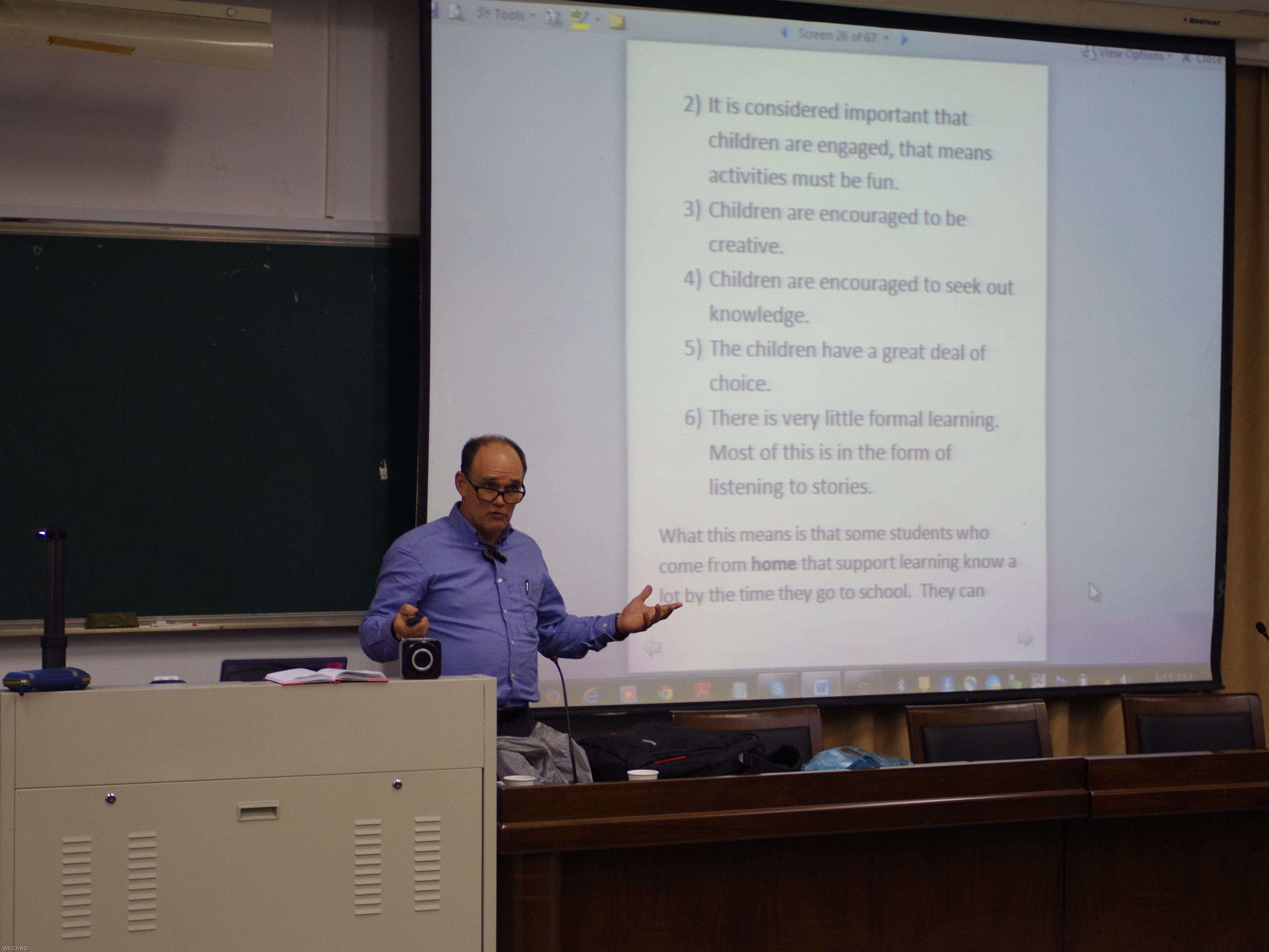 首先,以澳大利亚为例,Stephen Norton博士为我们展示了西方教育方式。与同学们一起探讨了中西方教育的一些差异。与中国教育方式不同的是,西方教育注重从玩中学。西方的小学一般采用小班化,由20到28个人组成一个班,因此可以更好地强调社会建构主义。西方教育要求以学生为中心,老师起着学习促进者的作用。孩子可以决定自己做什么,决定自己什么时候完成任务。西方教育强调学习一定要有趣,要鼓励学生去寻找知识,并且给他们足够多的选择。