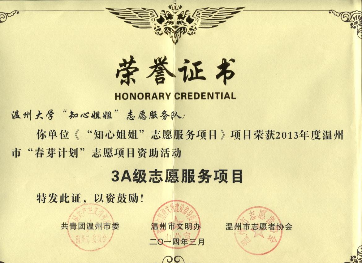 3月5日下午,温州市志愿服务工作委员会在市人民大会堂四楼新闻厅隆重举行2014年“温州市学雷锋志愿服务工作会议暨温州市志愿者协会四届二次会议”。我院“知心姐姐”荣获2013年团市委春芽计划3A 级项目及2013年温州市志愿服务创新项目奖荣誉两项殊荣。