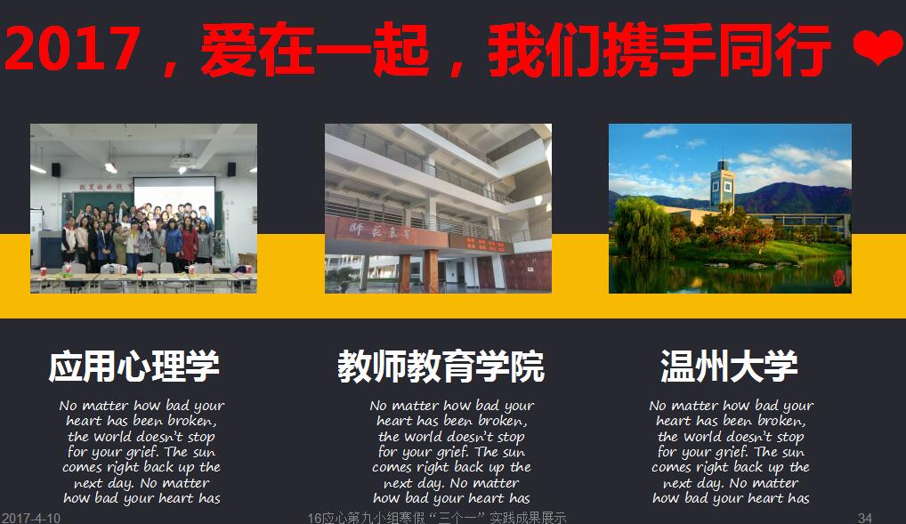 近日,心理系学生假期招生宣讲汇报会在热烈的掌声中拉开了帷幕。汇报会由14级应心同学竺凯娜主持,出席本次汇报会的老师有颜文靖、陈美芬、翁树澍、朱倩云、陈宥辛、徐淑慧和吴超智等7位老师。会上,各实践小分队代表按照抽签顺序轮流上台进行为时7分钟的报告,那流畅多变的PPT,丰富多彩的照片,遍布全国各地中学的足迹,尤其代表们自信从容的演讲中流露出专业自豪感,令在座的老师们赞叹不已。各个小组专业宣讲颇有创意,各显特色,有的先从学校的简介入手,配上美轮美奂的校园图片,向高三学弟学妹们展示温大的魅力,然后介绍心理学专业的相关学习内容、就业率以及一些先进的实验设备等等,全方位展现了温大心理学专业的优势;有的结合自己的大学生活经验,采用讲故事的形式向高中生们展示温大心理学子们的学习生活,如生动的课堂,神奇的VR实验,爱心飞扬的公益活动;有的则采用互动和提问的方式,从高中生的需求出发,用幽默有趣的方式帮助他们了解温大的心理学......老师们一边专注的听着,一边根据宣讲感染力、小组合作情况及完成质量等进行评分,评出个人一、二、三等奖和先进小组若干名。