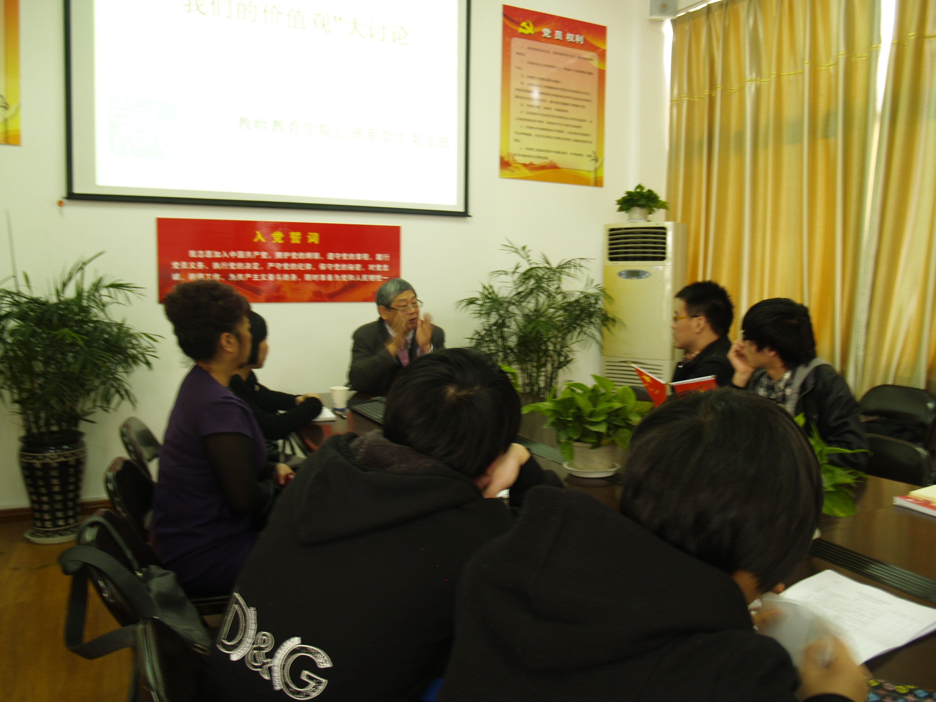 心理系学生党支部有幸请来了世界温州人微笑联盟会长、著名温籍台胞何纪豪先生来参加我们支部的“我们的价值观”大讨论活动。会议在我院党员之家举行,由章园园老师主持。