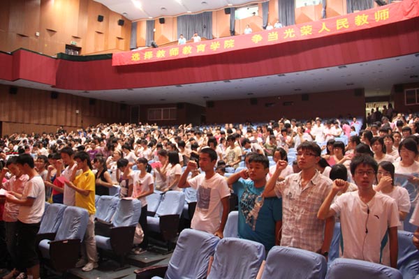在开学典礼上进行入学宣誓活动是我院今年迎新工作的一个创新,壮观的的入学宣誓现场,也将开学典礼推向高潮。“我宣誓,严格遵守大学生行为准则:志存高远,坚定信念;热爱祖国……”在新生代表管叔萍的带领下,全体新生在晚会上宣读了了p站视频