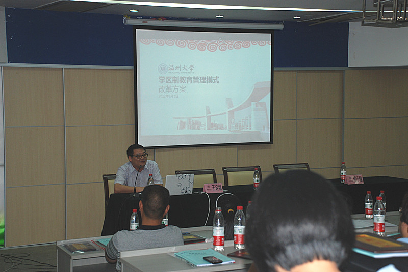 学生处王定福处长为大家解读了“学区制教育管理模式的改革方案”。他从“学区”概念的由来、温大学区制教育管理模式改革方案的构建、学区制改革所面临的现实挑战以及相应的对策等四个方面,向各位老师清晰地解读了学区制改革的内容。他认为,学区制改革是高校育人工作的一项重大探索,是一个新生事物,需要一个磨合、调整的时期,希望各个学院和各位老师都能支持这项改革,促进学区制改革目标的实现。