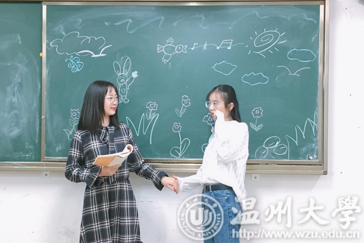 一个个睡前小故事被我们生动地讲述,在黑板上的儿童绘画背景的映衬下,我们演讲的故事变得更加生动有趣,我们在讲到生动情节的时候还时不时配上手势动作,同学们的兴致也被逐渐调动了起来。