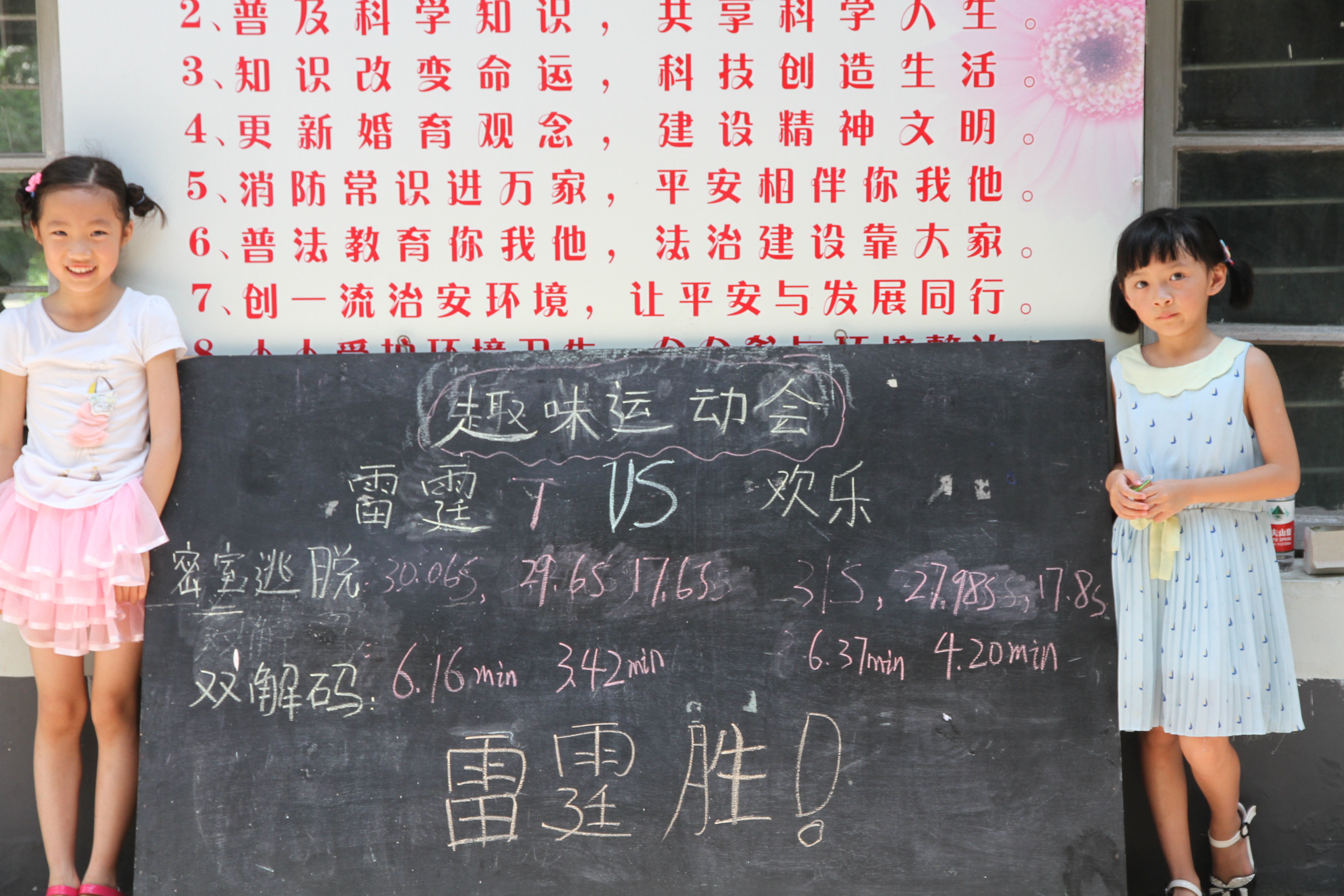上午8:30,趣味运动会在一片紧张而又欢乐的氛围中进行。一开始实践队员将小朋友分成了两组,并让他们取一响亮的队名。小朋友们也不负众望分别取名为“雷霆队”与“欢乐队”。后便开始了紧张而又欢乐的活动,第一个项目是“关闭石门”,要求小朋友们全体要参与,面朝天,下腰通过规定的线,时间短的获胜。第二项目是“双解码”,有了上一个游戏的铺垫,“翻纸牌”的游戏也得心应手了。由于时间限制,“跳大绳”,“坐地起身”等游戏没有进行,最后雷霆队获得了胜利,给两队都颁发了奖品。虽然时间是短暂的,但此次趣味运动会还是圆满的结束了。