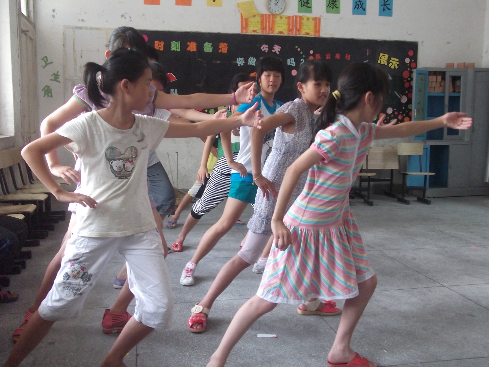 7月14日,距离汇报演出只有一个礼拜的时间,为了给众位领导和枫岭乡的乡民带来一场视听盛宴,队员们不辞辛苦,顶着大太阳,和学生们一起投身在紧张的训练之中。