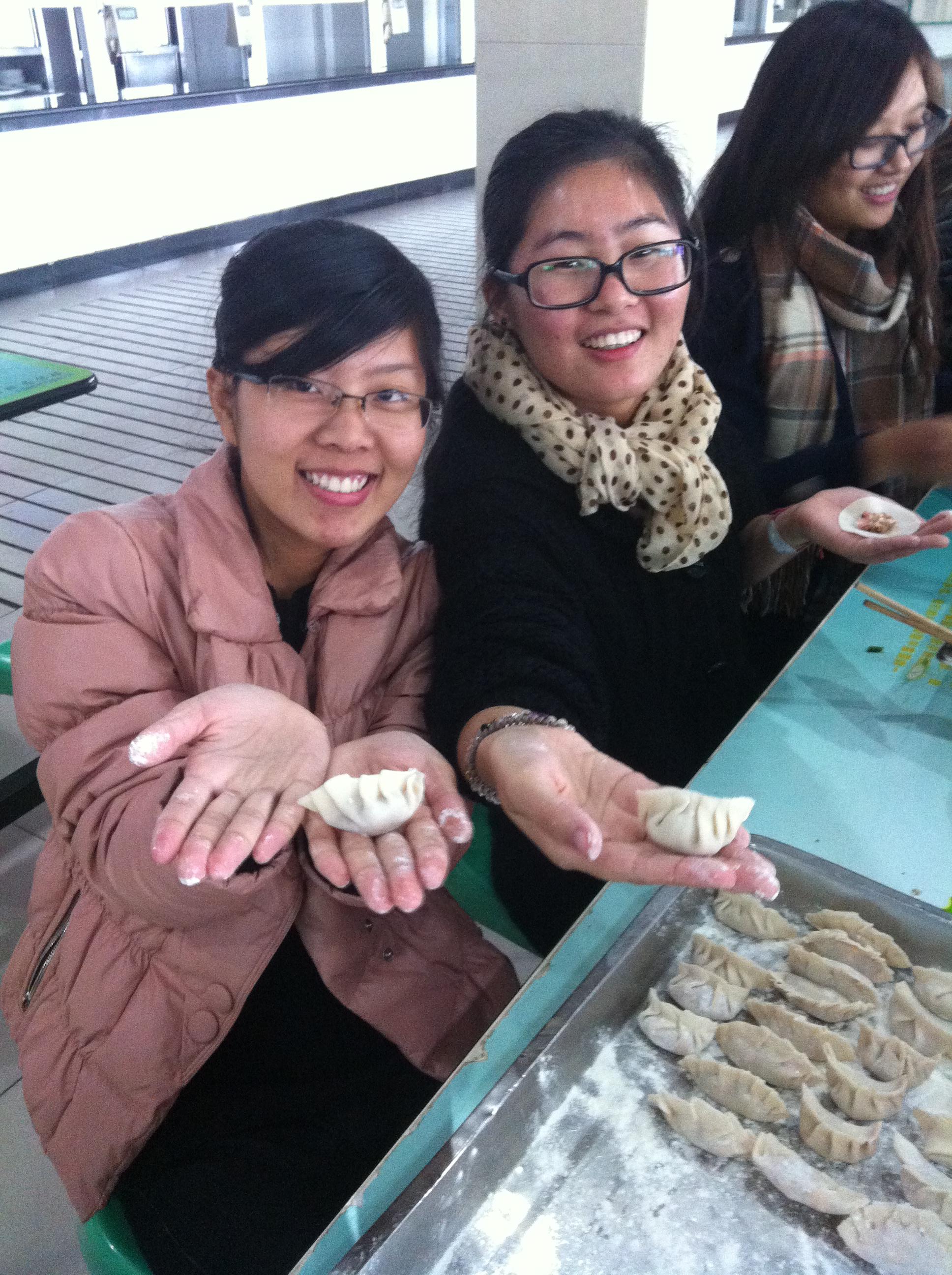 活动在下午1点准时开始。而在这之前,班委们早已抵达食堂,并在工作人员的热心帮助下,洗菜、切菜,最终将各种口味的馅儿整齐有序地摆放在了餐桌上。同学们围绕在餐桌周围,选择好自己喜欢的饺子馅儿,开始动手包饺子,不会的同学边看边学,会的同学耐心示范,大家都沉浸在欢声笑语中。在包饺子的过程中,团支书还安排了有关厨房小知识的竞答,同学们在体验包饺子的乐趣的同时,还从中学习到了许多的生活小窍门。