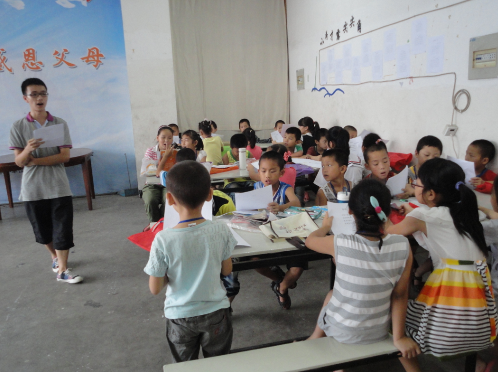 朗诵课程是实践队的又一主要课程。这课程旨在培养孩子们语言技巧,提高他们的语文素养。作为语言工作坊成员的队长韩伟政同学,将精心准备的材料发放给同学,让孩子们先自己品读材料。之后,韩伟政同学为孩子们细心地讲解朗读古诗的技巧与所需要的情感,并亲自为孩子们示范了朗诵。韩伟政同学铿锵有力,饱含情感的朗诵深深打动了每一个孩子。听完韩伟政同学的朗诵示范,孩子们认真地开始学习朗诵。一时间,教室里便充满了孩子们朗朗的读书声。接着,韩伟政同学还邀请了一些勇敢的同学上台来展示自己学习的成果。成员们高兴地发现有不少孩子很快地掌握了朗读的技巧,很好地讲古诗的情感表达出来。
