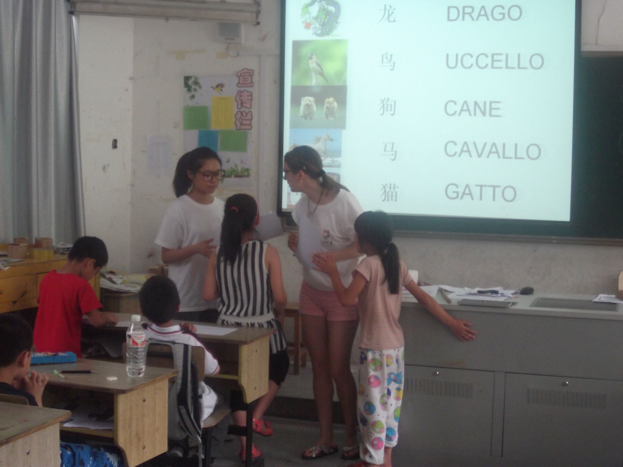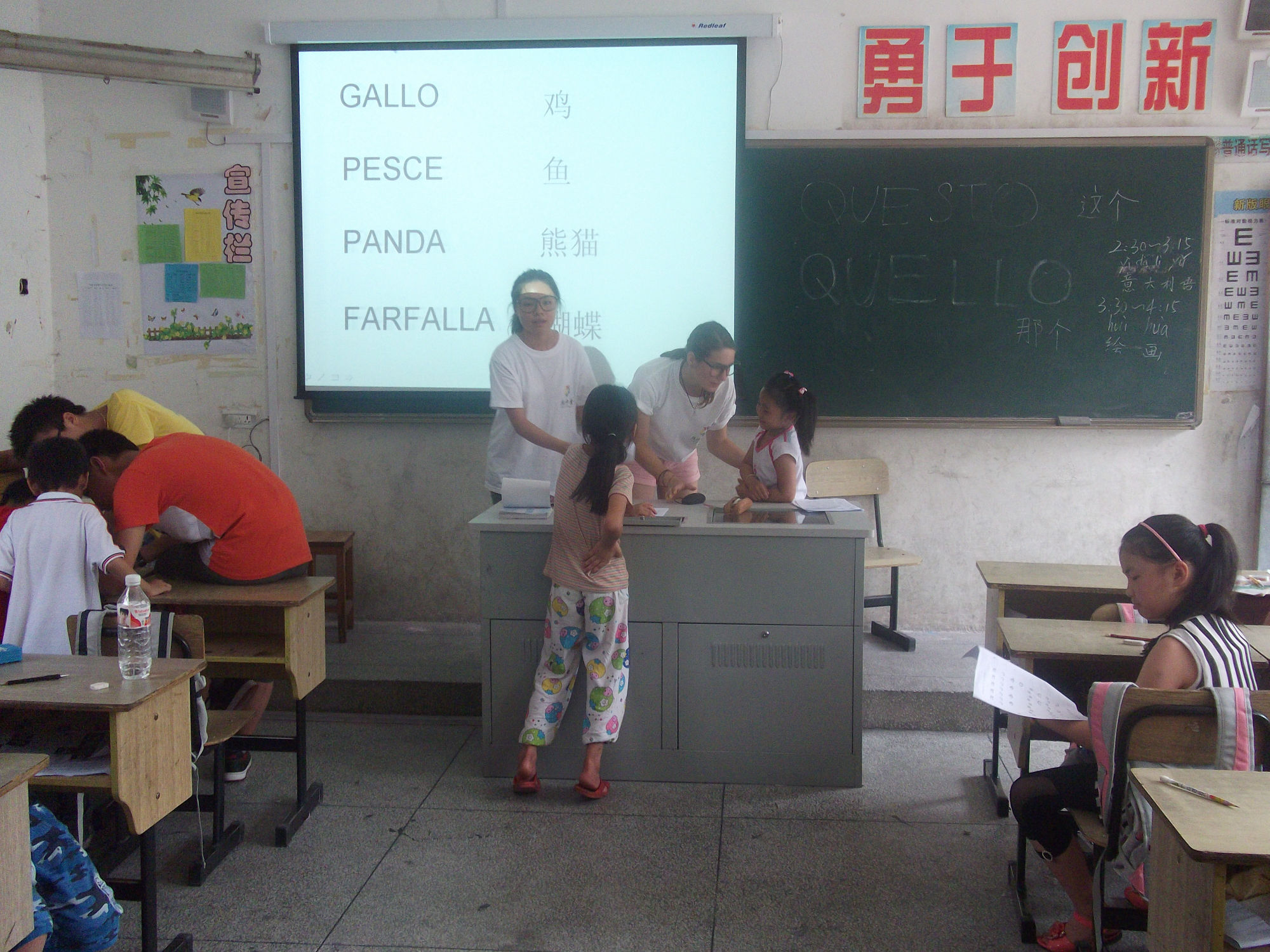 随着上课铃声的响起,同学们一起用意大利语热情地欢迎两位外教,老师对同学们能够如此快速地掌握意大利语给予了高度表扬。课堂上,外教先用短短的几分钟时间帮助同学们复习之前学过的内容:十以内的数字、如何询问他人的年龄和四种动物。看到同学们已经可以熟练地说出动物的名字,两位外教便趁热打铁,发下一张小纸,引导同学们各自动手在纸上画出小动物的形象。面对这种表现自己的机会,同学们充分地发挥自己的想象,各种栩栩如生的动物形象渐渐地呈现在一张张白纸上。接着,老师举着全班同学的“佳作”,让同学们用意大利语说出动物的名字,加强学生们对知识的掌握,并嘱咐学生在课后将作品贴在班级的后面,以达到将课堂所学与生活所需紧密结合的目的。然后,同学们又学习了龙、鸟、狗等六种动物。这节课热闹非常,终于,课堂在两位意大利外教的积极引导下结束了,但是学生们却还热情地邀请老师多上几分钟,同学们对意大利语的兴趣可见一斑。