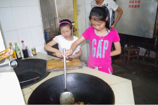 友谊是相互的,孩子们也时时刻刻想到安民·萤光实践队的成员,常常给成员们意想不到的惊喜。今天,他们亲自当起了“大厨”,想要为安民·萤光的成员们露一手,让他们尝一尝自己的手艺。平时文文静静的小女孩立刻化身成为“点火总指挥”,像模像样地生起火来,小朋友们分工合作,一个切菜、一个倒油、一个炒菜,烧菜的功夫绝不亚于安民·萤光的成员们。其中的一个成员,还对孩子们进行了指导。在大家的共同努力下,一盘盘菜肴新鲜出炉,有洋葱炒蛋、冬瓜肉片、油焖茄子……虽然成员们给了孩子不少的帮助,但这些菜肴完全融入了孩子们的爱心和关心,吃得每位成员心里暖洋洋的。