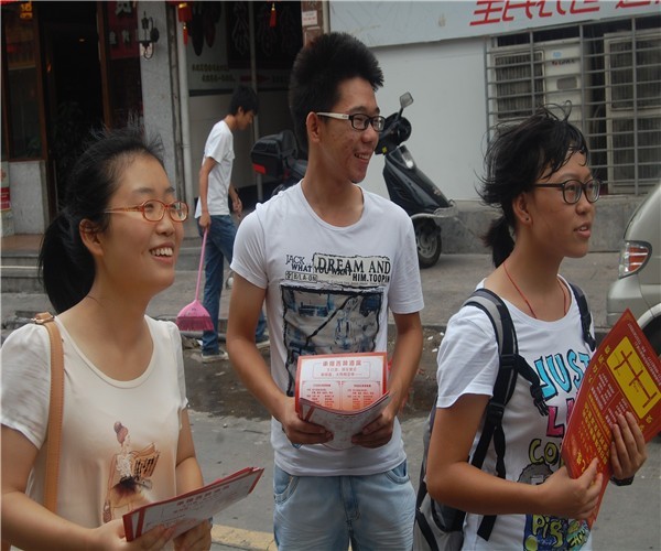 “海已楼”从实践之初始,一直对“心翼”及救助站的孩子们提供物资上的帮助,为此,心翼特拨出六人小组在茶山附近分发“海已楼”的宣传单。到了傍晚,有不少客人闻讯而来,酒楼工作变忙,除去四位在寝室编辑软文的队员,其余的人均前往海已楼服务。
