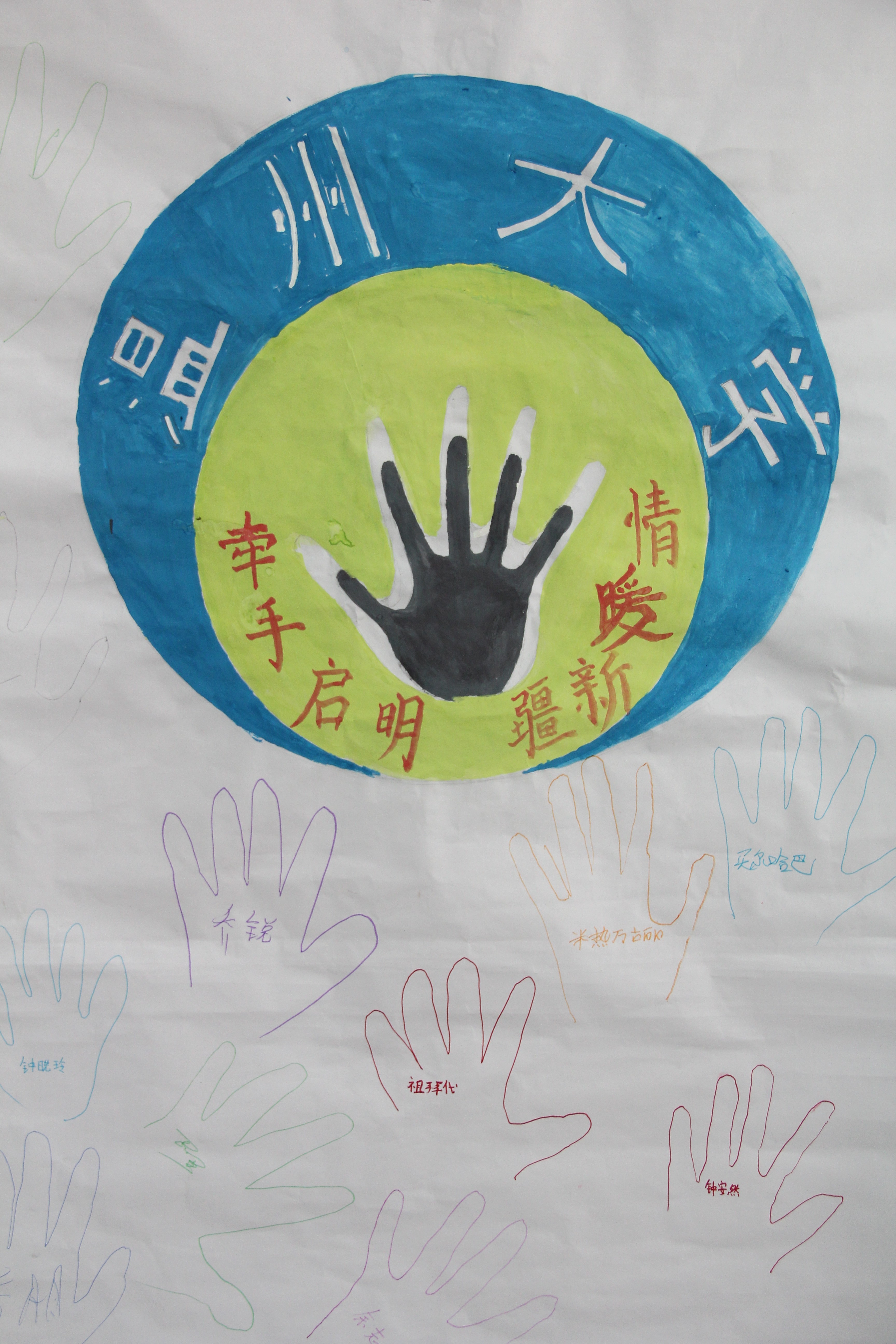 今天,成员们画的队徽海报派上了用场。当初画这张海报的目的就是为了让孩子们留下他们的印记,也希望让这个团队在孩子们的心中留下足迹。成员们把海报张贴在墙上,让孩子们一个个排好队,轮流在纸上画上自己的手,并在手掌里签上自己的名字,代表着大家都是一个大家庭,团结友爱在一起。当然,成员们也会不时地帮孩子们画自己的小手。有时候,成员和孩子们在一起用手势比划着民族团结等手语,这是多么温馨的场面啊。在欢声笑语中度过着每一个大家共同经历的日子,分享开心亦或是不开心,那都是一种交流,一种心灵上的衔合。